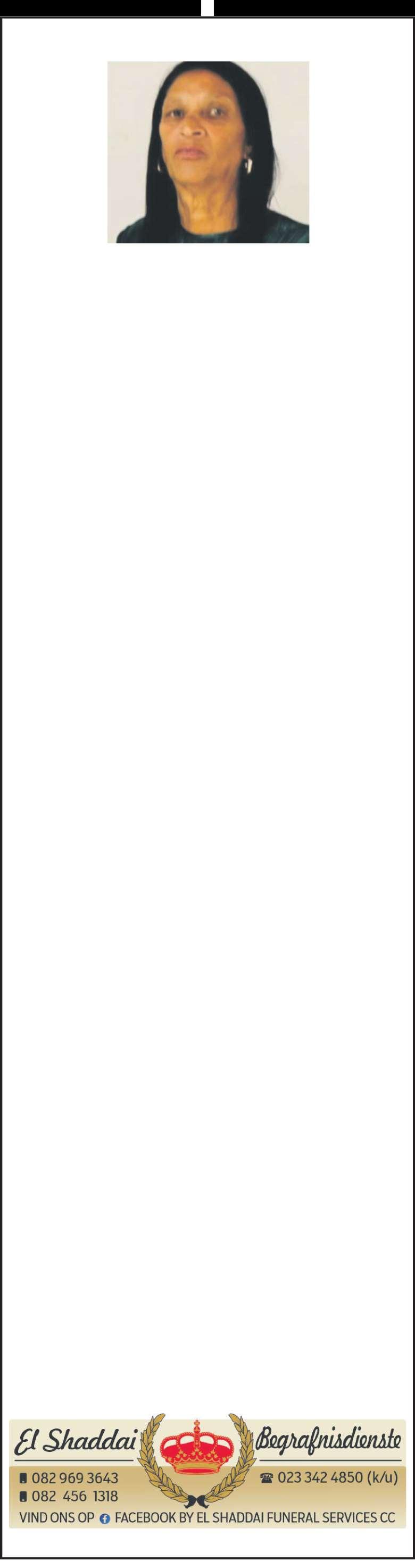 Begrafnisdiens vind plaasSaterdag,31Januarie 2026 om 09:00 by Multanastraat17, Hexpark en om 10:00 by ZionA.M.EKerk,LeSueurstraat