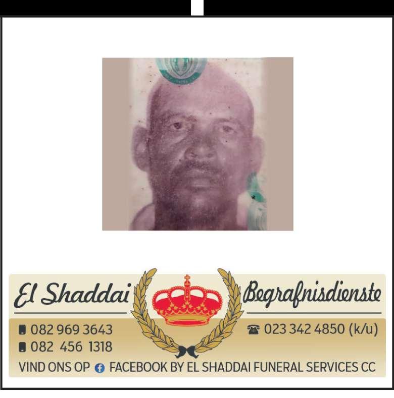Begrafnisdiens vind plaasSondag, 01 Februarie 2026 om 10:00 by Glen HeatliePlaas, De Wet. CUPIDO, GERALD CHRISTOPHER GEB:13.05.1946 -GEST: 22.01.2026