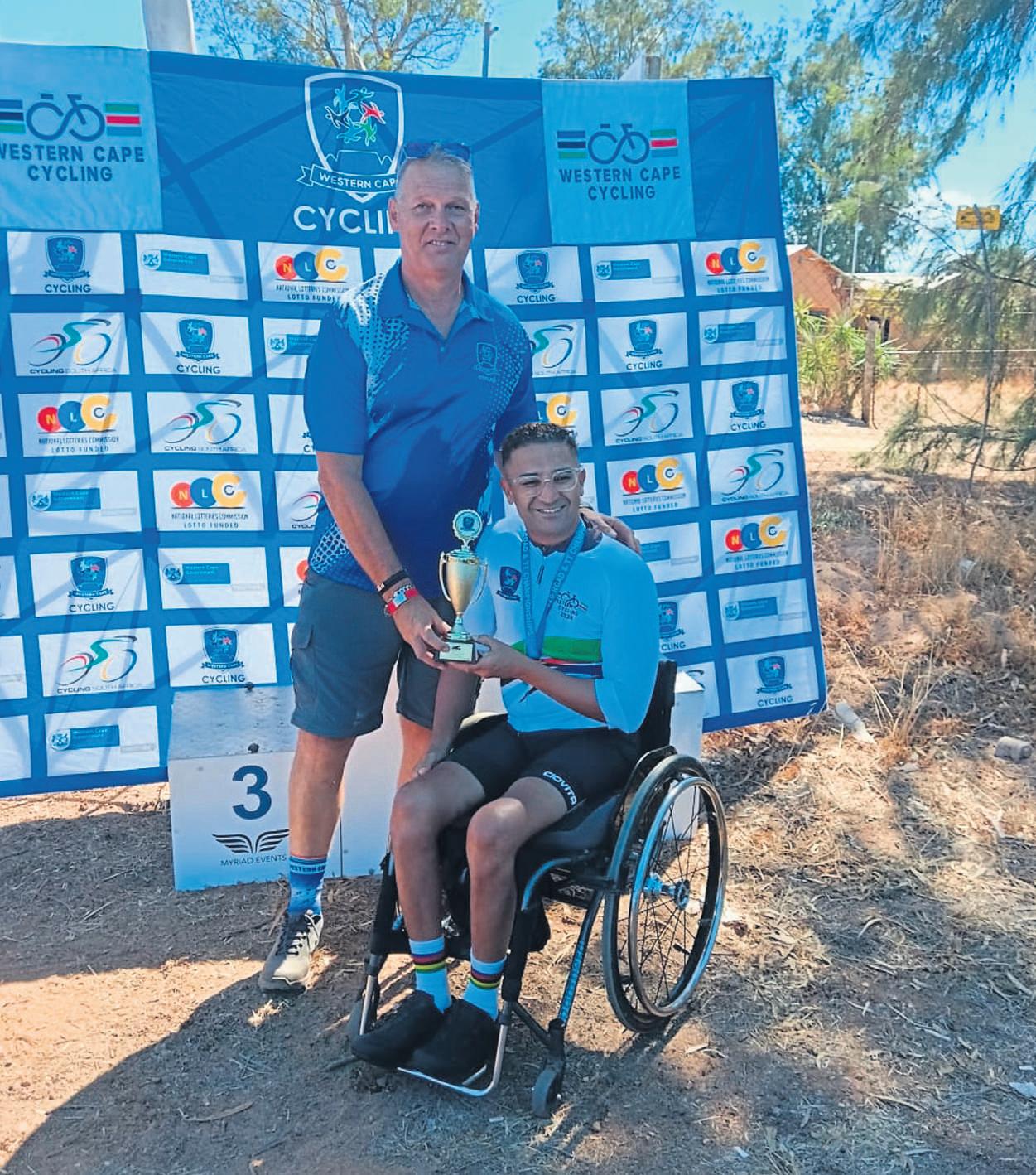 Lyndon vanWyk (regs) ontvang sy trofee na afloop vanvanjaar se Wes-Kaapse Kampioenskap.Byhom is CornéBenz, voorsittervan Wes-Kaapse Fietsry.