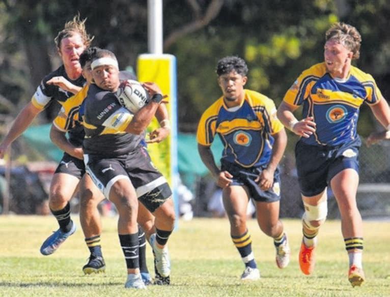 Tain-randellBooysen, woeligelosvoorspeler vandie Sanlam BolandKavaliers, bars deur die UWK-verdedigingslinie in hulvriendskaplike wedstryd.Die Kavashet die studentemet 100-0 verslaan.Die wedstryd wasdeel van’nsportdag watdeur VillagersMontagu(Sesduim) op die King Edward sportgrondeinMontaguaangebied is. Foto: Norman Evertson