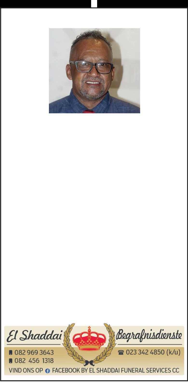 Met groothartseer neem onsafskeid vanons geliefde Pa en oupa.Jysal altydinons harte voortleef. OnsgaanDaddy mis Monique, Cameron,Riaan, Chezley,Alvenia, Lynn, Jowell en kleinkinders Rus in vrede onsgeliefde broer. Joususters, broers en familie