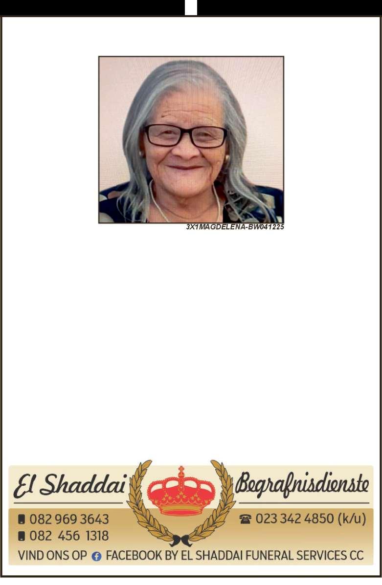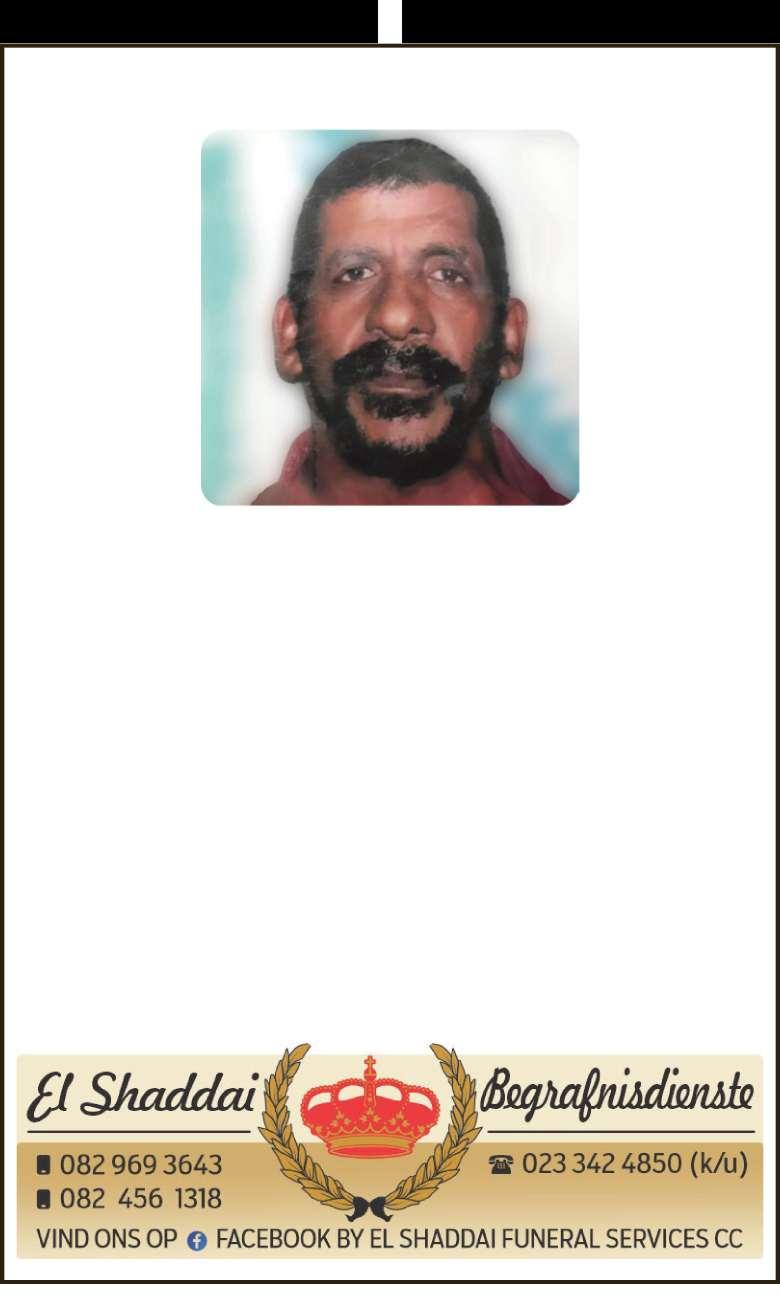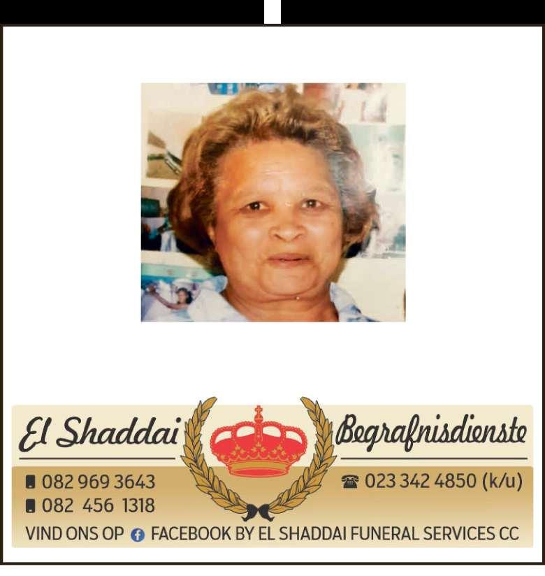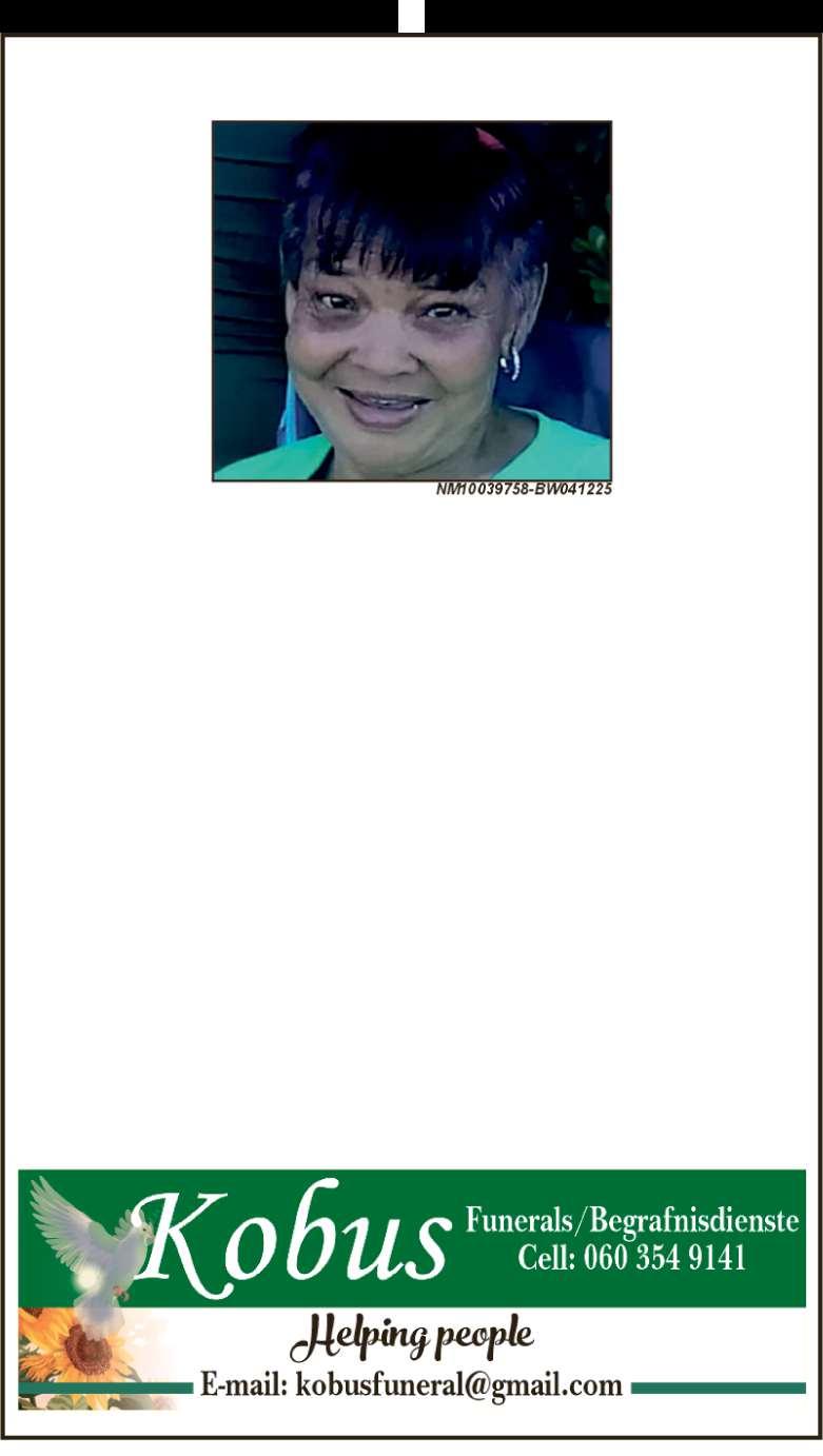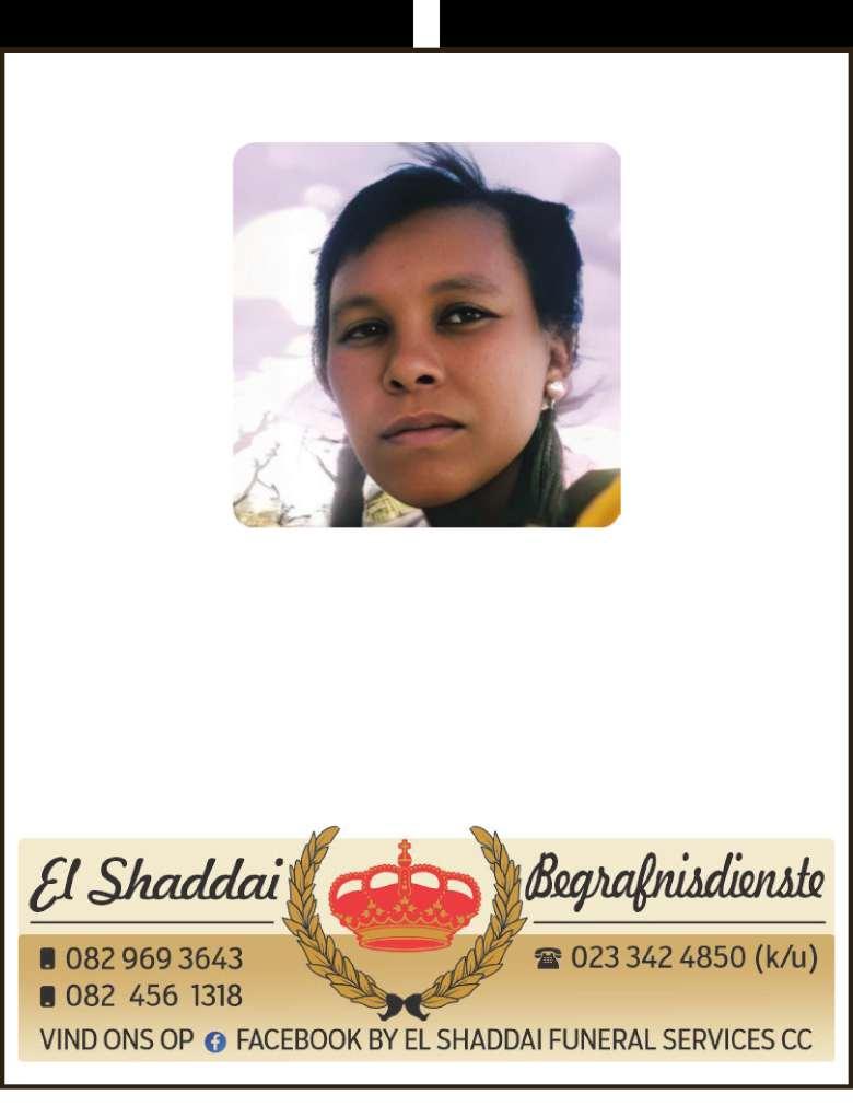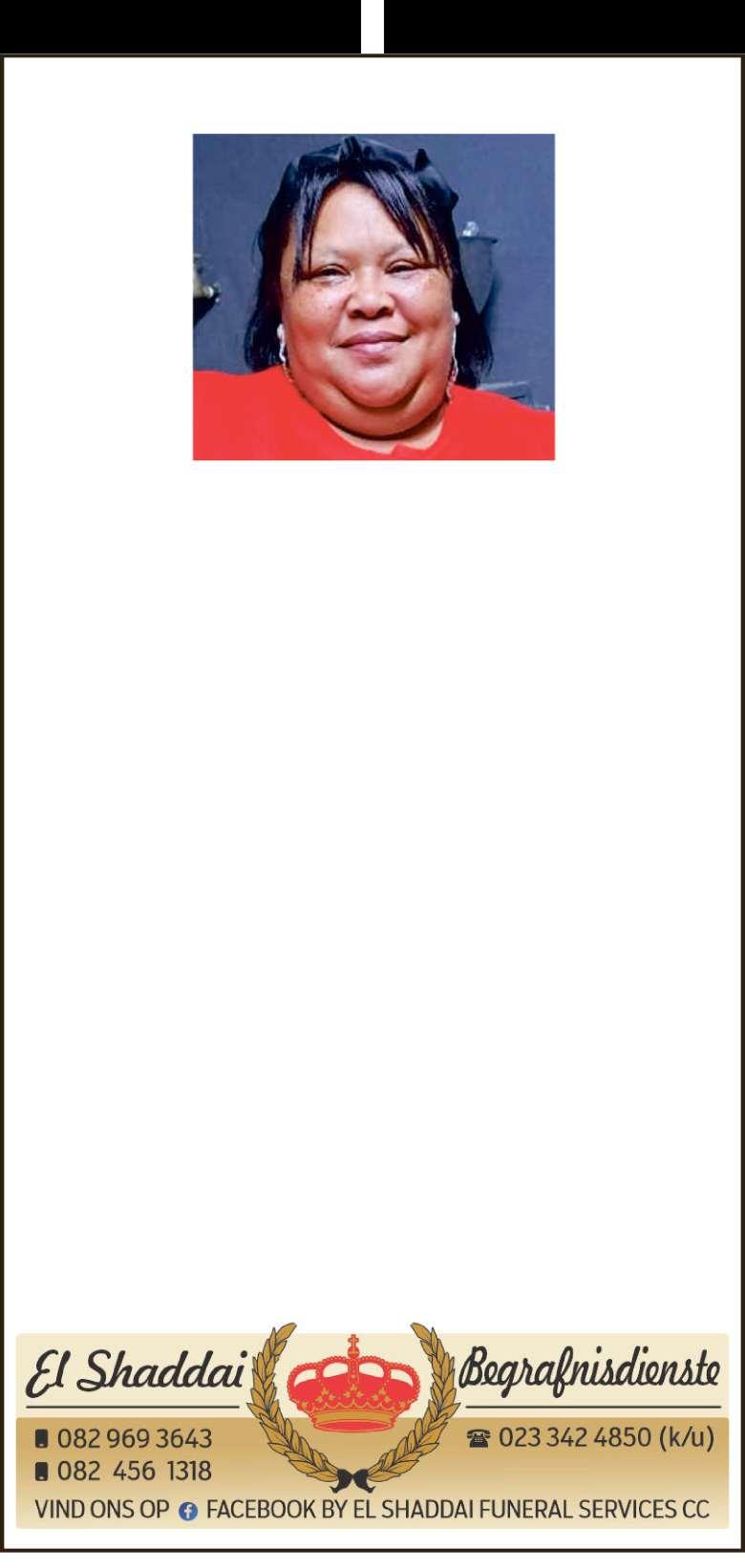 Begrafnisdiens vind plaas Saterdag, 06 Desember 2025 om 09:00 by Idlewindstraat 31, Hexpark en om 10:00 by PPK Ebed Kerk, Rhodestraat.