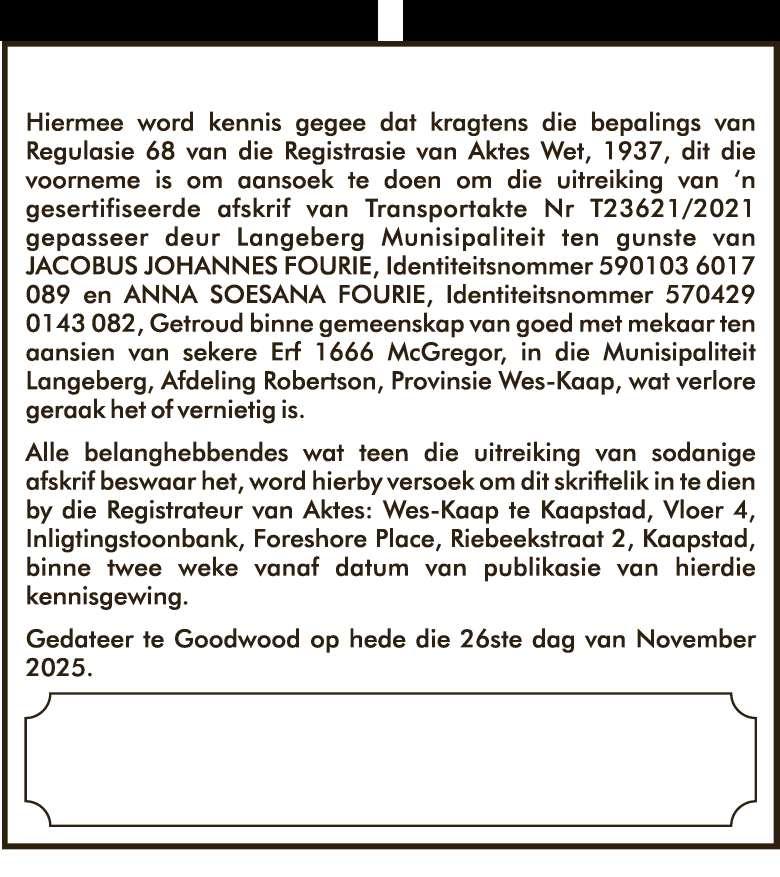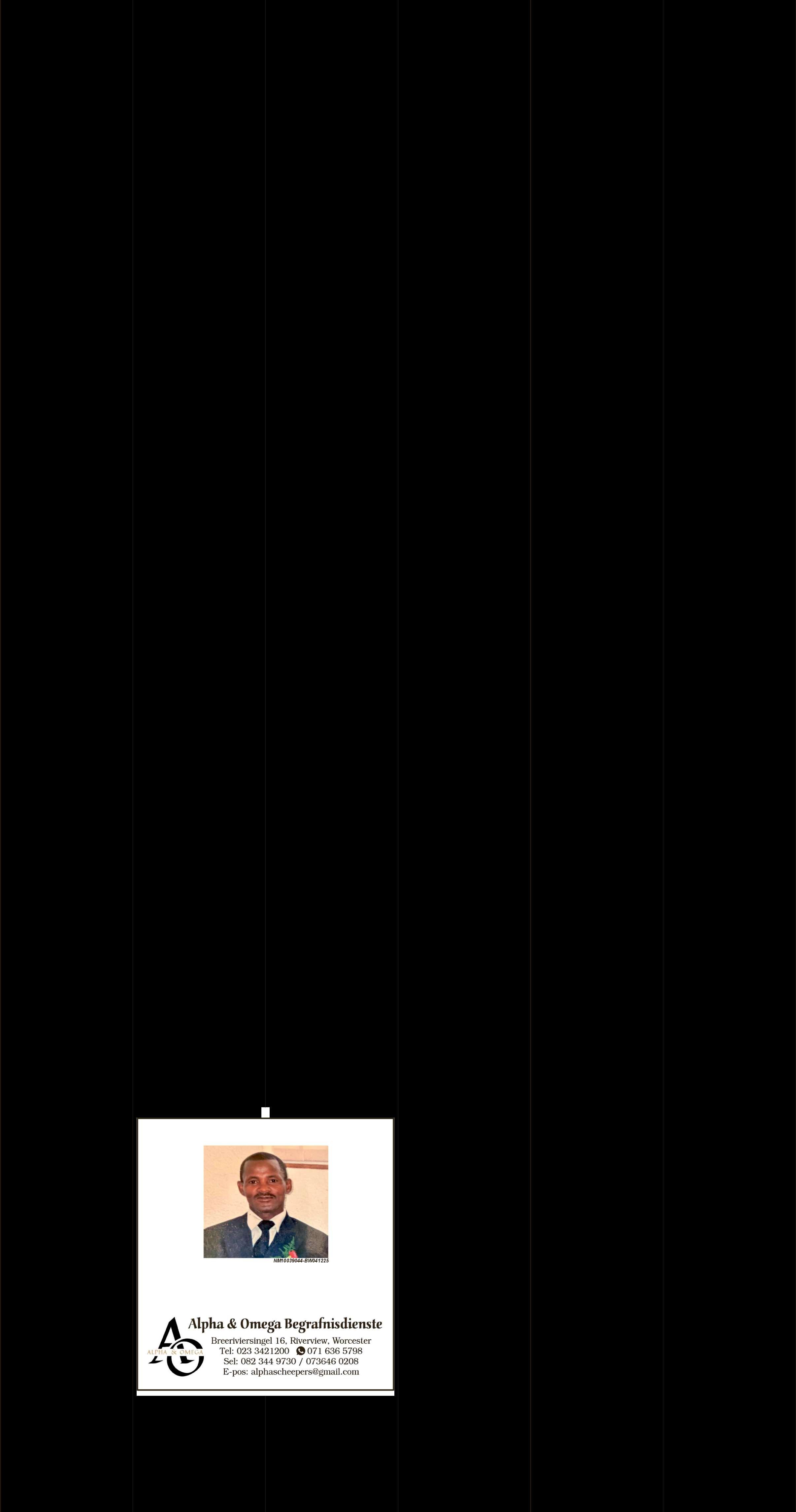 Begrafnisdiens vind plaas Saterdag, 06 Desember 2025 om 09:30 by Leipoldtlaan 53-A, Esselenpark en om 10:00 by VGK Worcester-Oos Kerk, Fischerstraat.