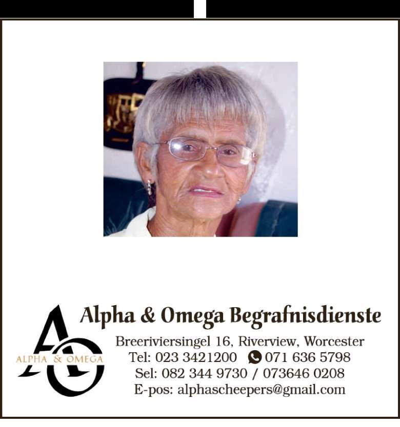 Begrafnisdiens vind plaas Saterdag, 06 Desember 2025 om 10:00 by Sampsonstraat 100, Riverview en om 11:00 by VGK Worcester-Suid Kerk, Swartstraat