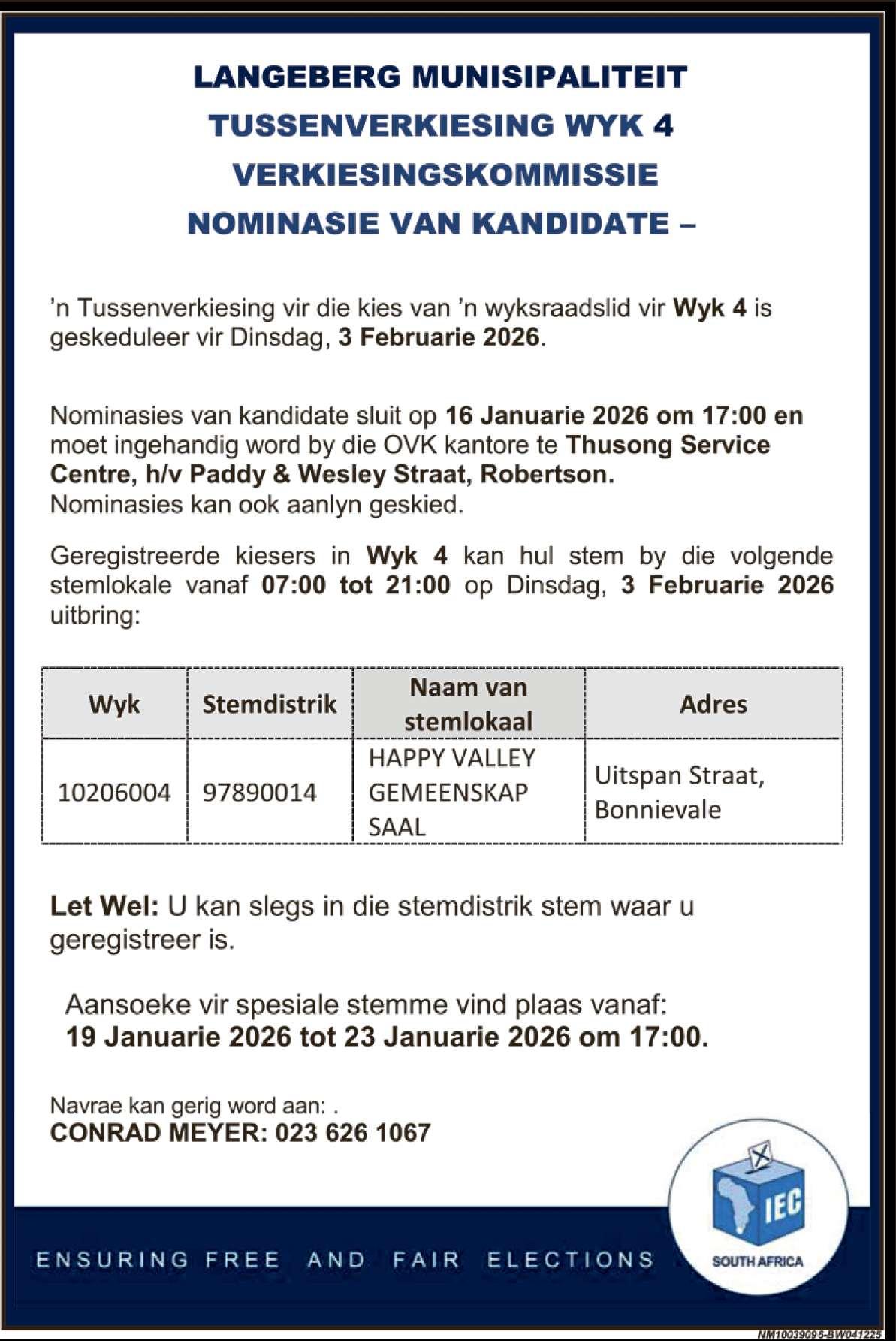 Isaziso siyakhutshwa ngokwe Candelo 49(1)(a)(i) elifundwa kunye ne Candelo 78(2) lo Mthetho woRhulumente wezeKhaya: uMthetho wakwa Masipala weRhafu kwi ndawo zobumnini, ka 2004 (uMthetho no 6 ka 2004), othi emveni koku ubizwe “uMthetho”, ukuba lo Mqulu Jikelele wokuqikelelwa kwamaxabiso endawo zobumnini weminyaka ka 2026/2027 –2030/2031 abahlali banako uzokuwuhlola kwi-osi zakwa masipala nakumathala eencwadi ukususela ngowe 28 EyeNkanga 2025 ukuya kutsho ngowe 2 Februwari 2026 Iifomu ezilungiselelwe ukuwuchasa lo mqulu zikwafumaneka kwezindawo zikhankanyiweyo nakwi websayithi ethi www.bvm.gov.za