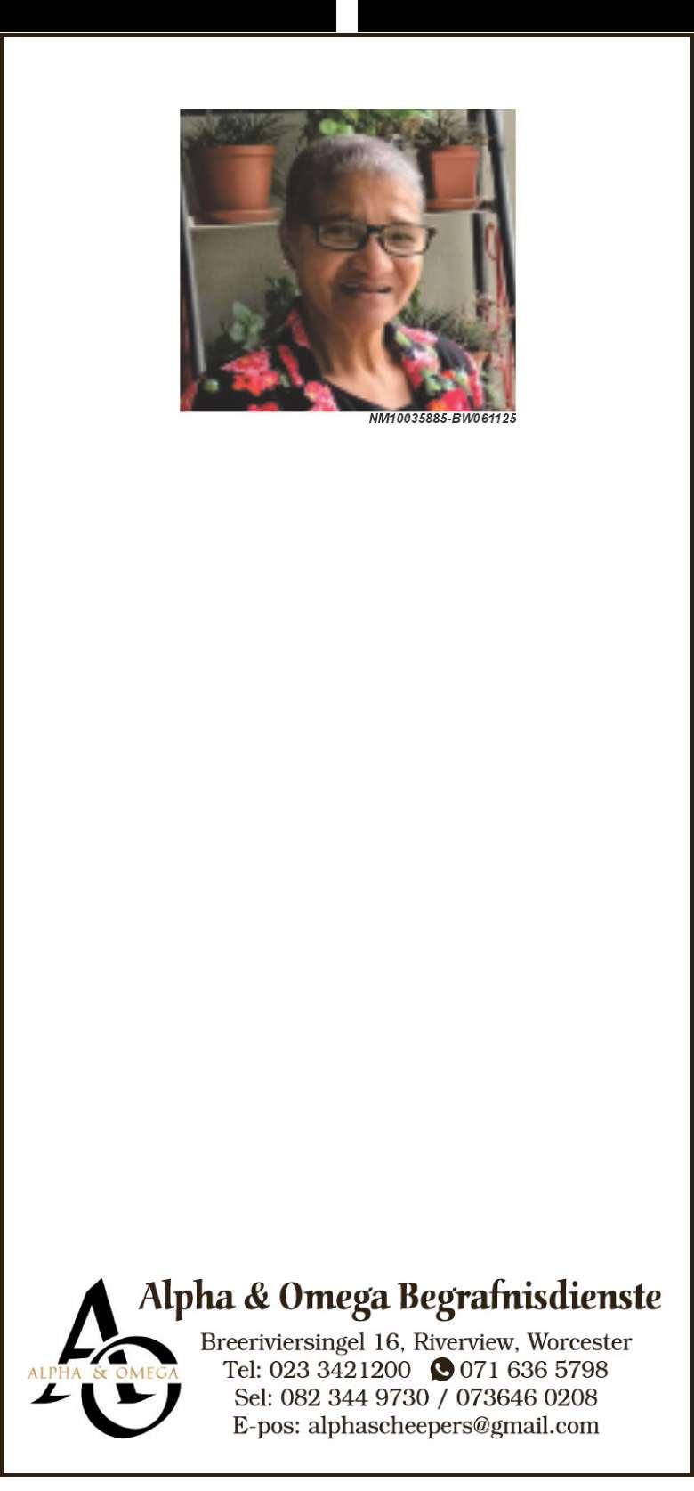 Begrafnisdiens vind plaas Saterdag, 08 November 2025 om 10:00 by Buitenkantstraat 279, Riverview en om 11:00 vanuit VGK Worcester-Oos, Fischerstraat.