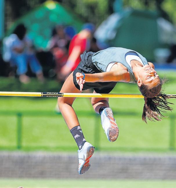 Fichardtpark-atlete blink op die baan en die veld uit. Hier spring Mieke Badenhorst oor die dwarslat.