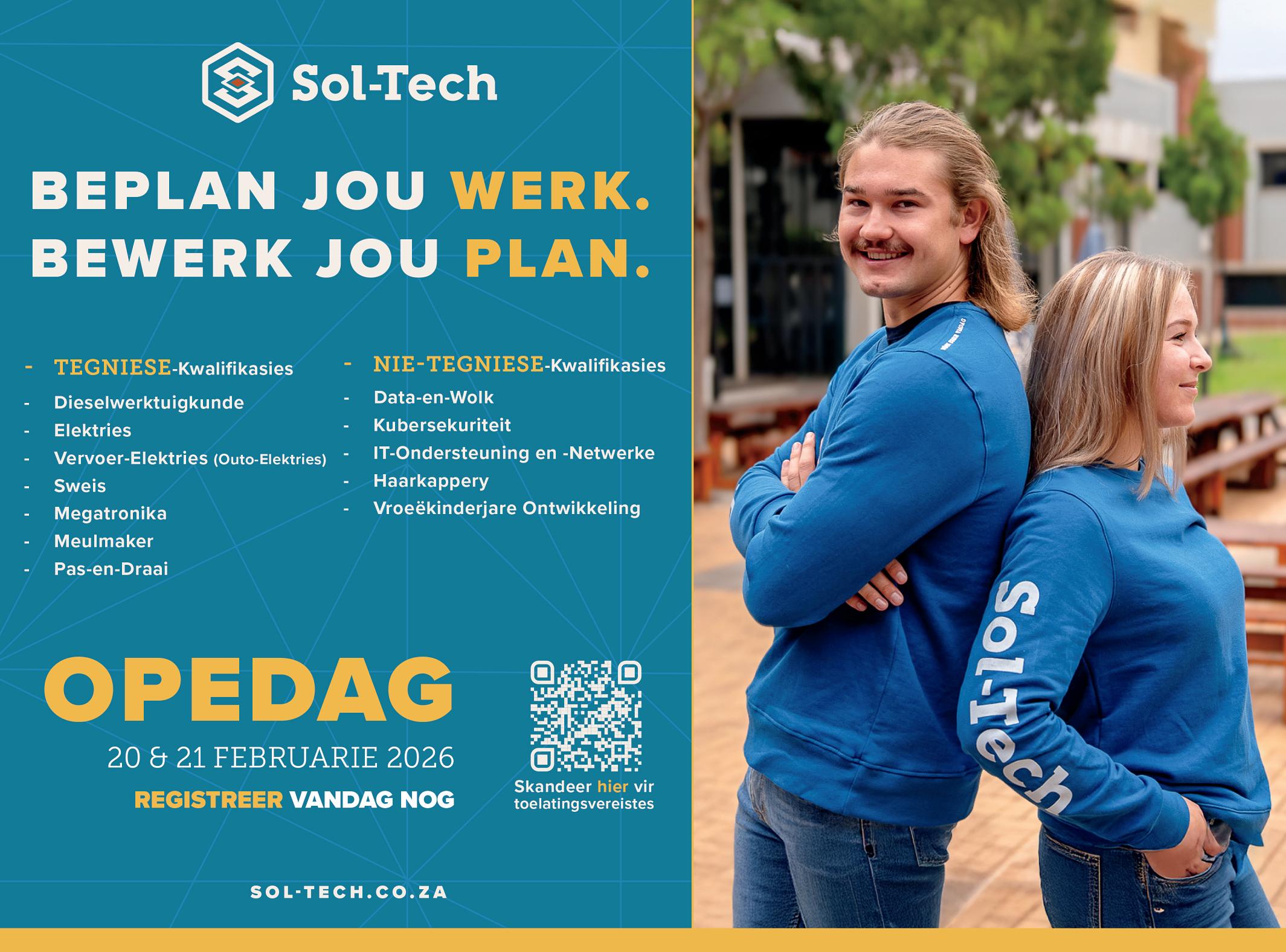 deur omstandighede beperk te word nie. Wanneer jy Sol-Tech kies om jou loopbaan mee te begin, staan jy aan die begin van ’n loopbaan wat waarde toevoeg, jou gemeenskap dien en jou ’n volhoubare toekoms bied.