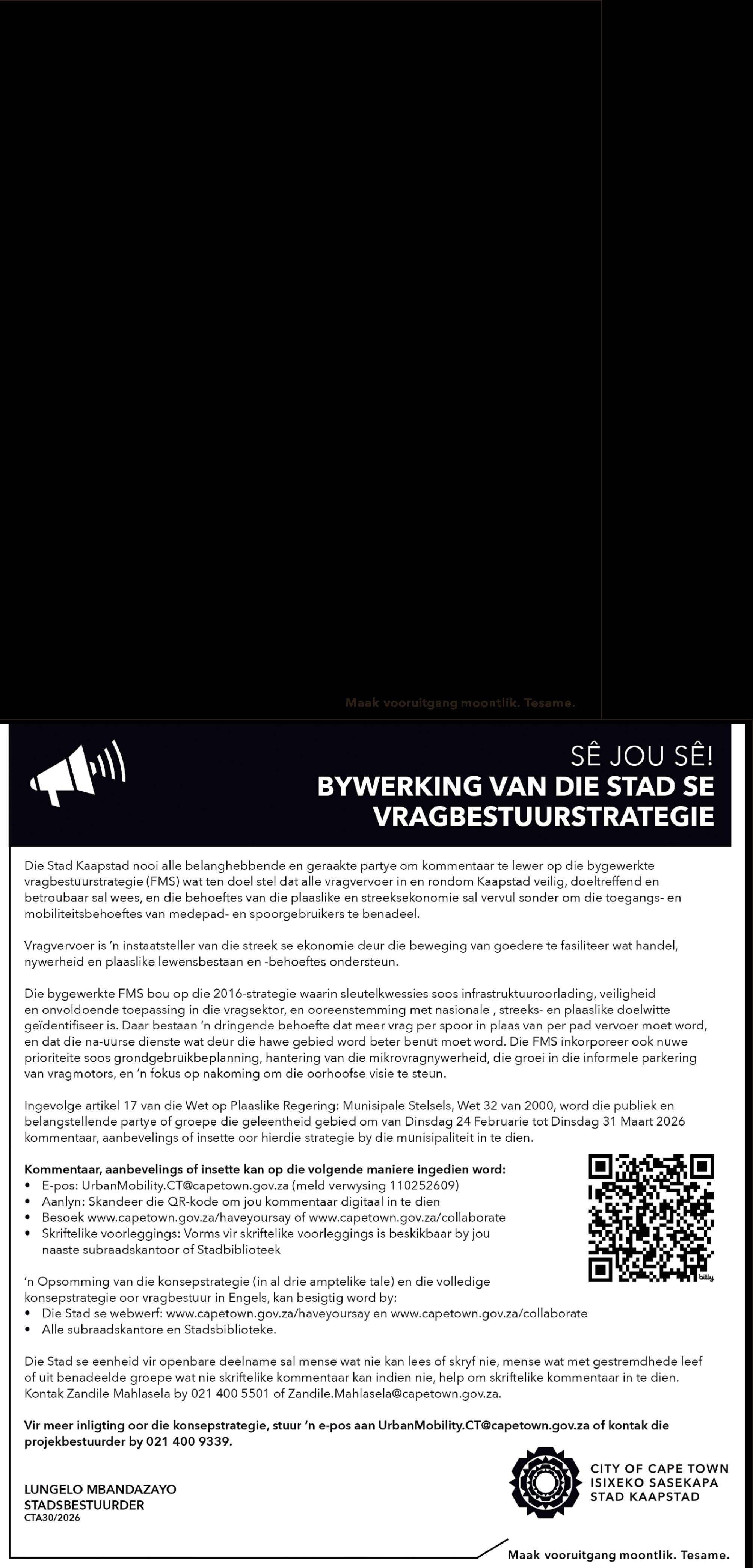 •Van 20 Februarie 2026 tot 31 Maart2026:Persoonlik -gedurendedie bedryfstye vandie lokale viropenbareinsae en besware hier onder