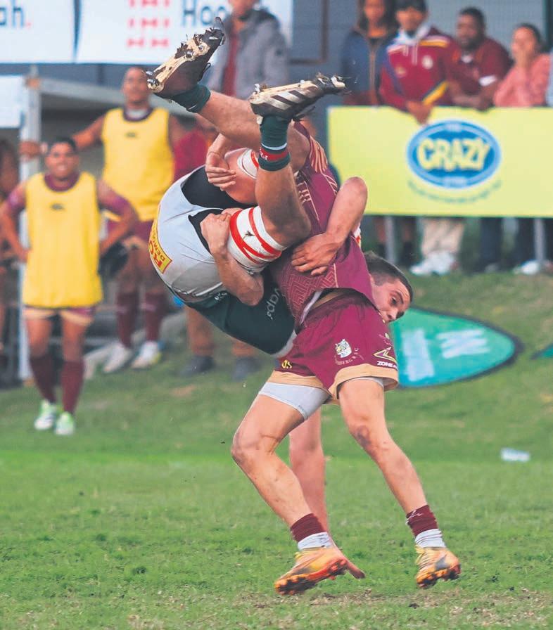 WRESTLINGFORPOSSESSION MichalHofmeyerofFalseBaybraceshimselfforanawkwardlandingasheisturnedupsidedownina tacklebyAngesGreenofTygerbergRugbyFootballClubduringaWPRUSuperAleaguematchplayedin ConstantiaonSaturday21June.Tiereweredeserved38-24winners.
