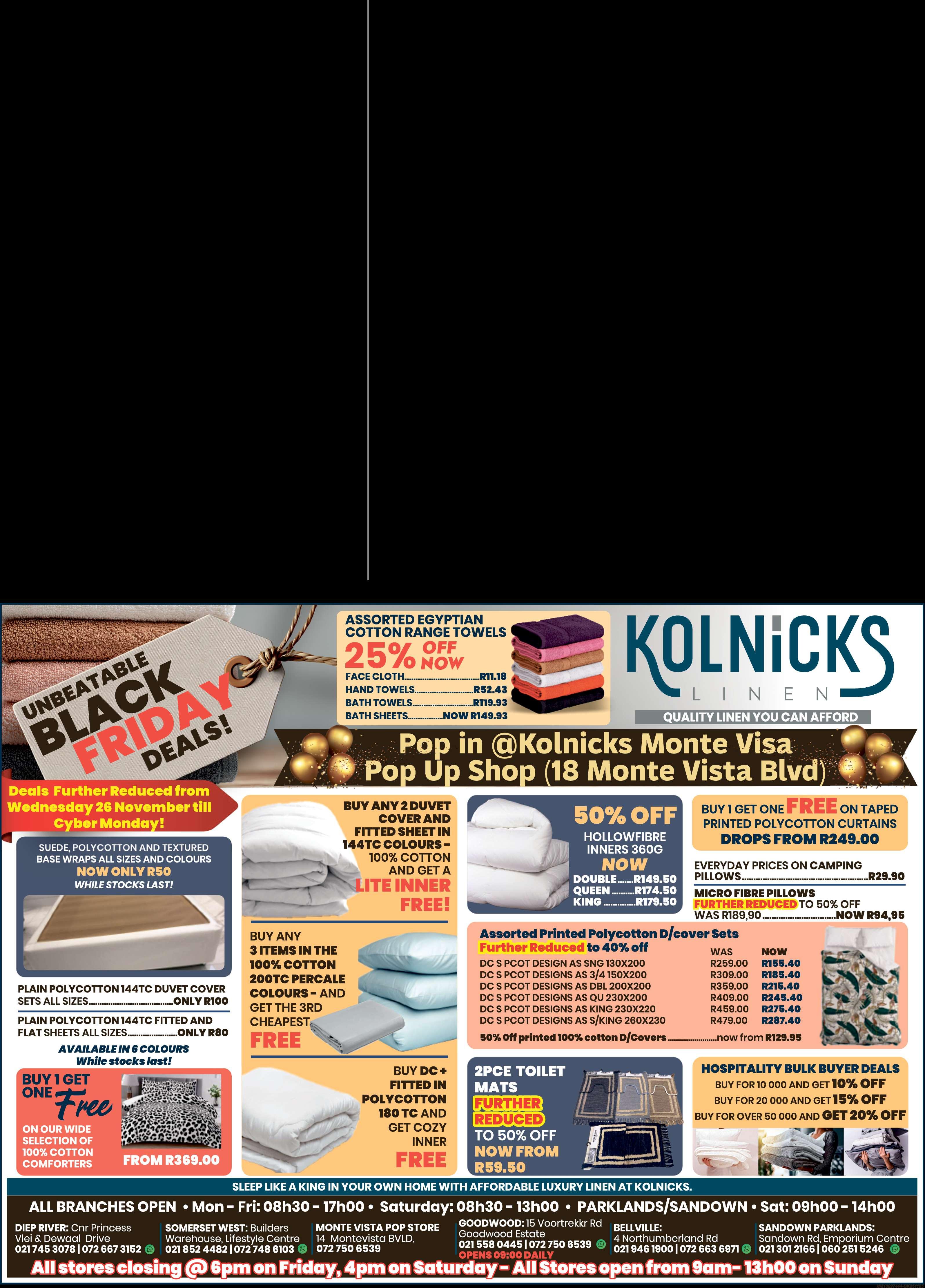 Somerset West, Strand, Penhill, Newlands, Constantia, Rondebosch, Observatory, Mowbray, Rosebank, Claremont, Kenilworth, Wynberg, Diep River, Pinelands, Durbanville, Brackenfell, Kraaifontein, Bellville and Parow North
