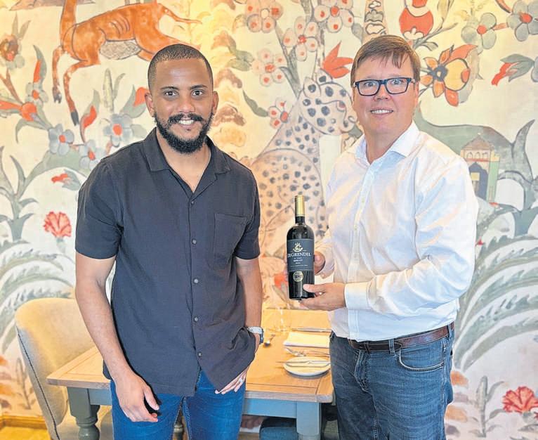 Morgan Steyn,wynmaker,by die bekendstelling saam met Sir De Villiers Graaff,eienaar van De Grendel Wyne