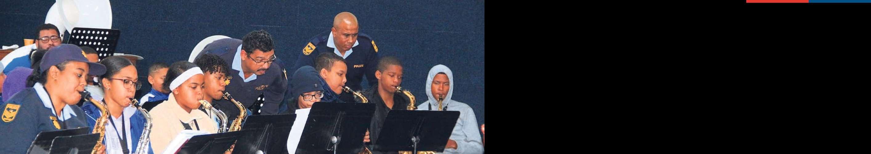 Members of the Western Cape Police Band and youth from Elsies River and Bellville performing at Elsies River High School.On the right is Sgt Wesley Jansen who taught the youth how to play in unity in a band or an orchestra