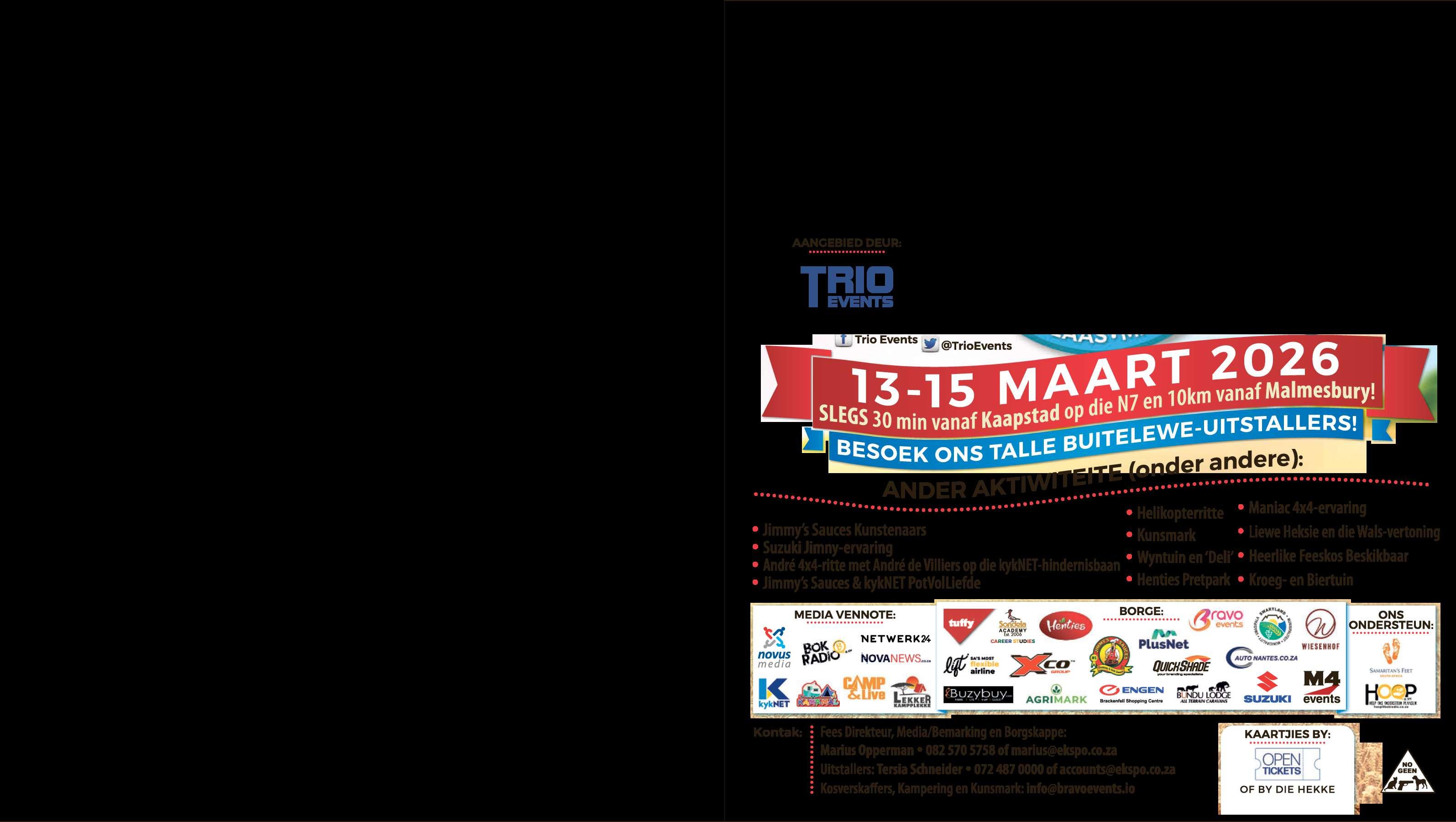 Andriette Norman; en die bekende Peer Papsak van Bokradio." Die seremoniemeester vir die dagisdie alombekende PedroKruger, wataldie deelnemers sal bekendstel en die wenners vangelukkigstrekkings deur die loop vandie middagsal aankondig. Vandie lekkerstepotte nóg is by verlede jaar se kompetisie opgedis, sê die organiseerders, wat vanjaarweer watertandresepteverwag. Die potte begin om 13:00 prut met hope gees en pret deur die loop vandie middag. Die spanne kanmeeding om as die kampioeneindie witvleispot-, rooivleispot-, bestepotpoeding- en bestegeesafdelingsaangewys te word . Kontak Marina by admin@tygerbergbc.co.za.