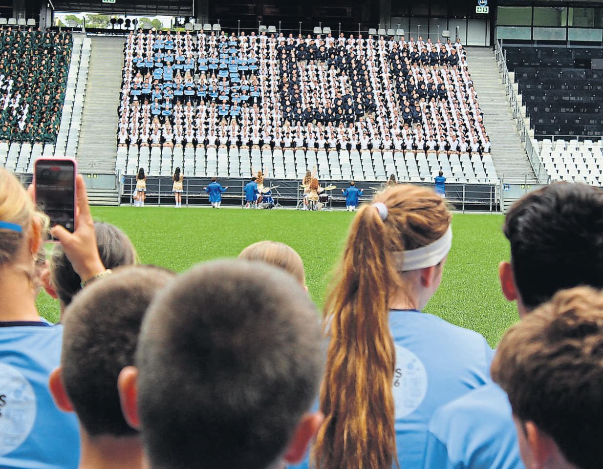 DF Akademie se leerderskyk toeterwyl dieskool se“flashes” uitgevoer word.DF Akademie het op die pawiljoen skoonskip gemaak deurbeide die“flashes”- en geesbeker te wen. FOTO’S:CARINAROUX