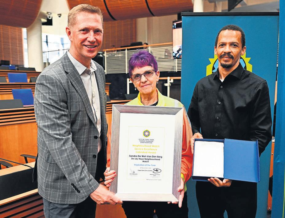 Sandra de Wet Van den Berg of the De La Haye Neighbourhood Watch in Bellville received the Inspiration of the Year Award. With her are JP Smith (left) and Rhelton Jooste of the City