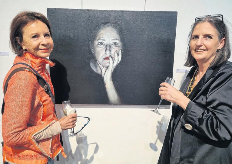 Marlene Truter from Durbanville and Frieda van Zyl of Rosendal Art & Framing in Durbanville admires the work titled“The unseen shift”in oil on canvas by Tessa Smit