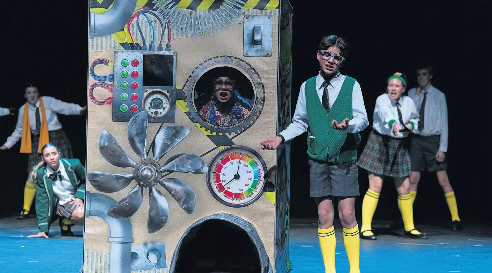 Christoff Els as Willie Wepener saam met (agrer van links) Sadie Owens,Emma Coetzer,Marianka van Eck en Hancke Els,almal in gr 7,in‘n toneel uit Die dag toe Willie Wepener skoolhoof geword het van die Laerskool Durbanville. FOTO’S: NARDUS ENGELBRECHT