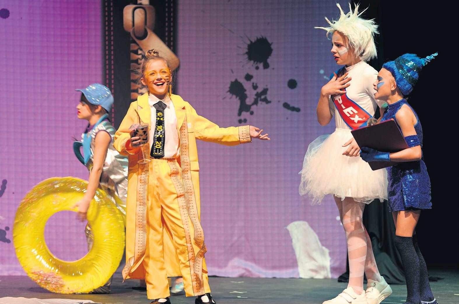 Van links is Emma Carstens (in agtergrond) as Snippy,die sker,Sophia Lourens as die geel liniaal,Zoë van Zyl as die Tipp-Ex,en Liani Jacobs as Penny,die pen,in die toneelstuk Potloodsakkie - agter die zip deur die Laerskool Durbanville Die leerders is almal in gr 4