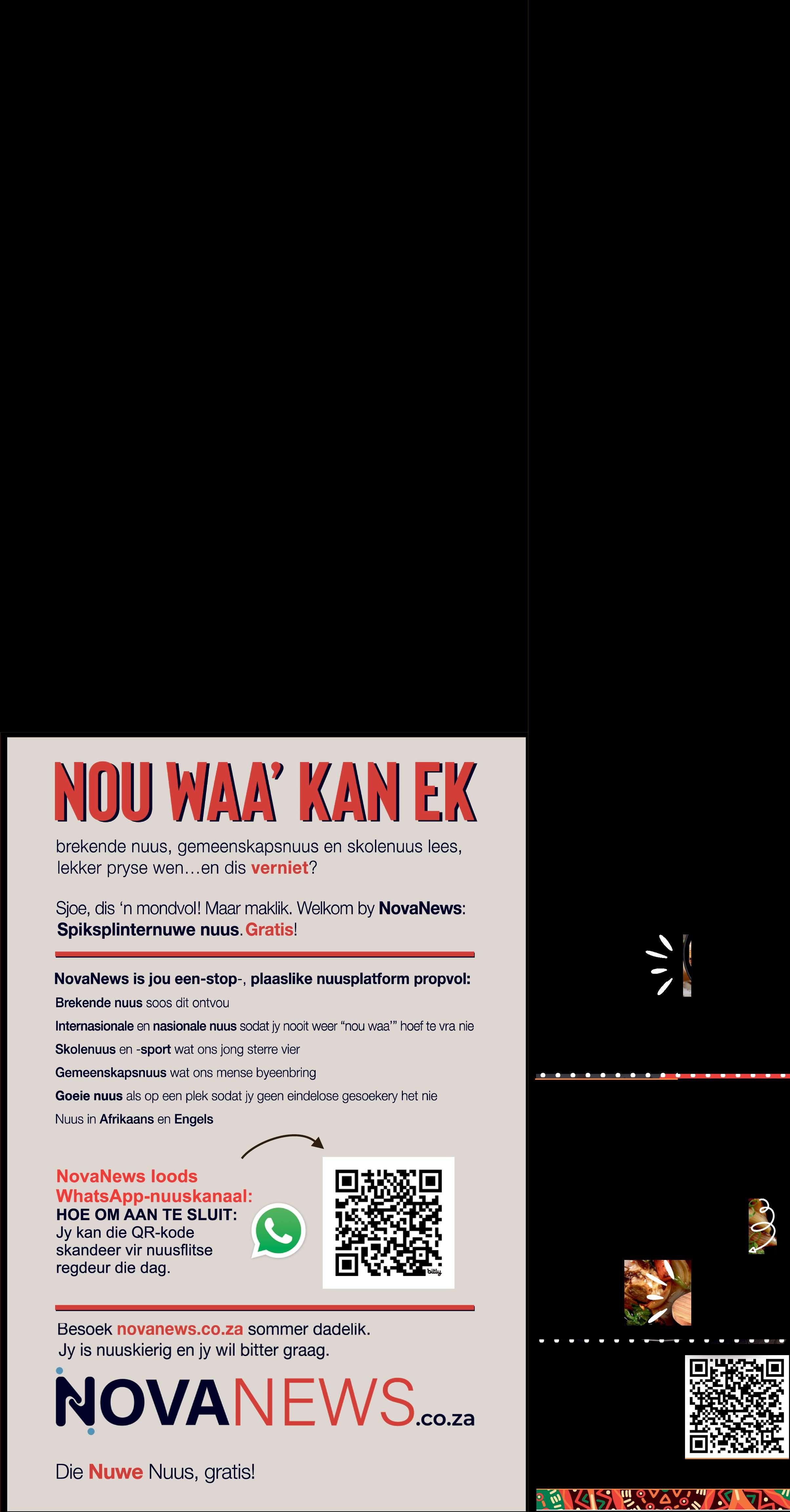 . 'n Kursus oor uitbranding en angs word op Vrydag 5 September van 18:30 tot 21:00 en op Saterdag 6 September van 15:00 tot 21:00, by Doxa Deo by Willowbridge aangebied. Die koste is R250 per persoon en sluit 'n werkboek, verversings en aandete die Saterdagaand in. Registreer voor 2 September by https://login.churchsuite com/?account=doxadeocape Kontak dr Anique Tredoux by anique tredoux@ gmail.com met navrae . Kom geniet die humoristiese konsert Die Begrafnissangers by die NG kerk Bellville-Riebeeck om 19:00 in die De la Haye-kerksaal. Kaartjies kos R50 vir volwassenes en R20 vir kinders (2–10 jaar). Heerlike hamburgers en pannekoek is te koop Bespreek by 021 919 1501 of koop kaartjies by die deur . Philadelphia se gewilde tradisionele boerebasaar vind plaas vanaf 17:00 op die kerkplein in Philadelphia 'n Aand vol kuier, kos en tradisie wag op jonk en oud. Die fees word weer soos altyd, om 18:00 met 'n regte haelgeweerskoot oopgeskiet Toegang is R10 per persoon en gratis vir nie-skoolgaande kinders Kaartfasiliteite sal orals beskikbaar wees. Rig navrae aan Annemart Agenbag by 072 431 2831.