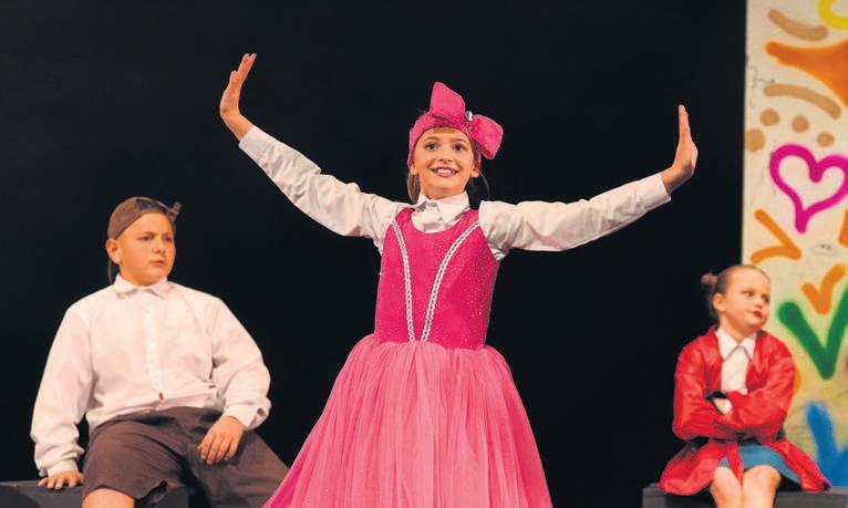 Perfekte Petronelle (Heléne van der Walt,gr.6) in die middel motiveer Marie om op glorie en prestasie te fokus in die Laerskool Gene Louw se toneelstuk Op die spel Agter haar kyk Xavier Nel (gr 6),links,en Chloe Kriel (gr.5) effe verveeld toe.