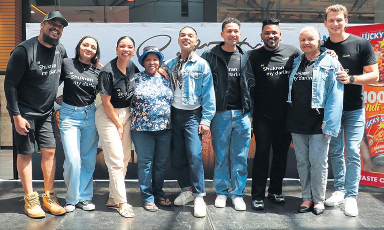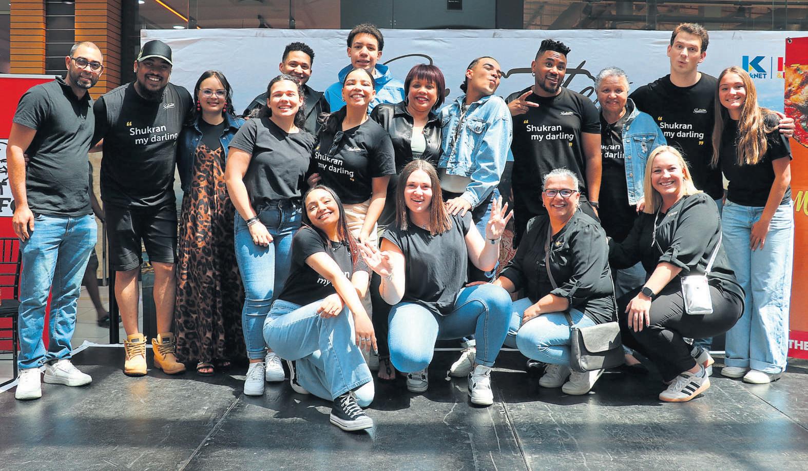 Elize Mentoor van Eersterivier is saam met (van links) Irvine van der Merwe (Nazeem),Char Carrie (Angie), Lauren Joseph (Zoë),Cole Wessels (Tino),Craig Adriaanse (Gary),Gantane Kusch (Siya),Theresa Sedras (Mrs J) en Eden Classens (Justin) Personeel van die Zevenwacht-winkelsentrum is hier saam met die akteurs