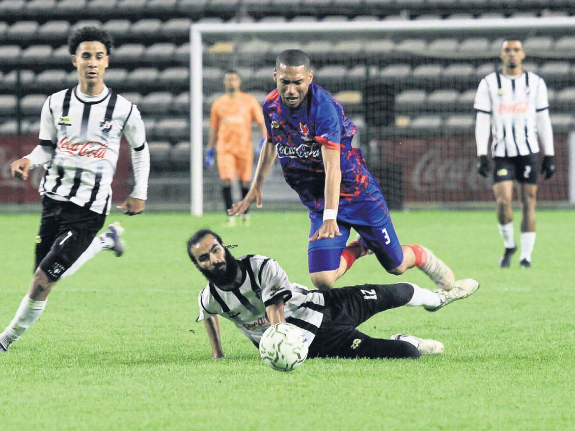 Morne Abrahams of Hanover Park FC is brought down illegally by Hamza Oumimoune of Vasco da Gama FC,the defending champions of the SAFA Cape Town Coke Cup,during the final played at Athlone Stadium on Saturday 18 October Hanover Park won the 30th edition of the competition 2-1 to dethrone the reigning champions