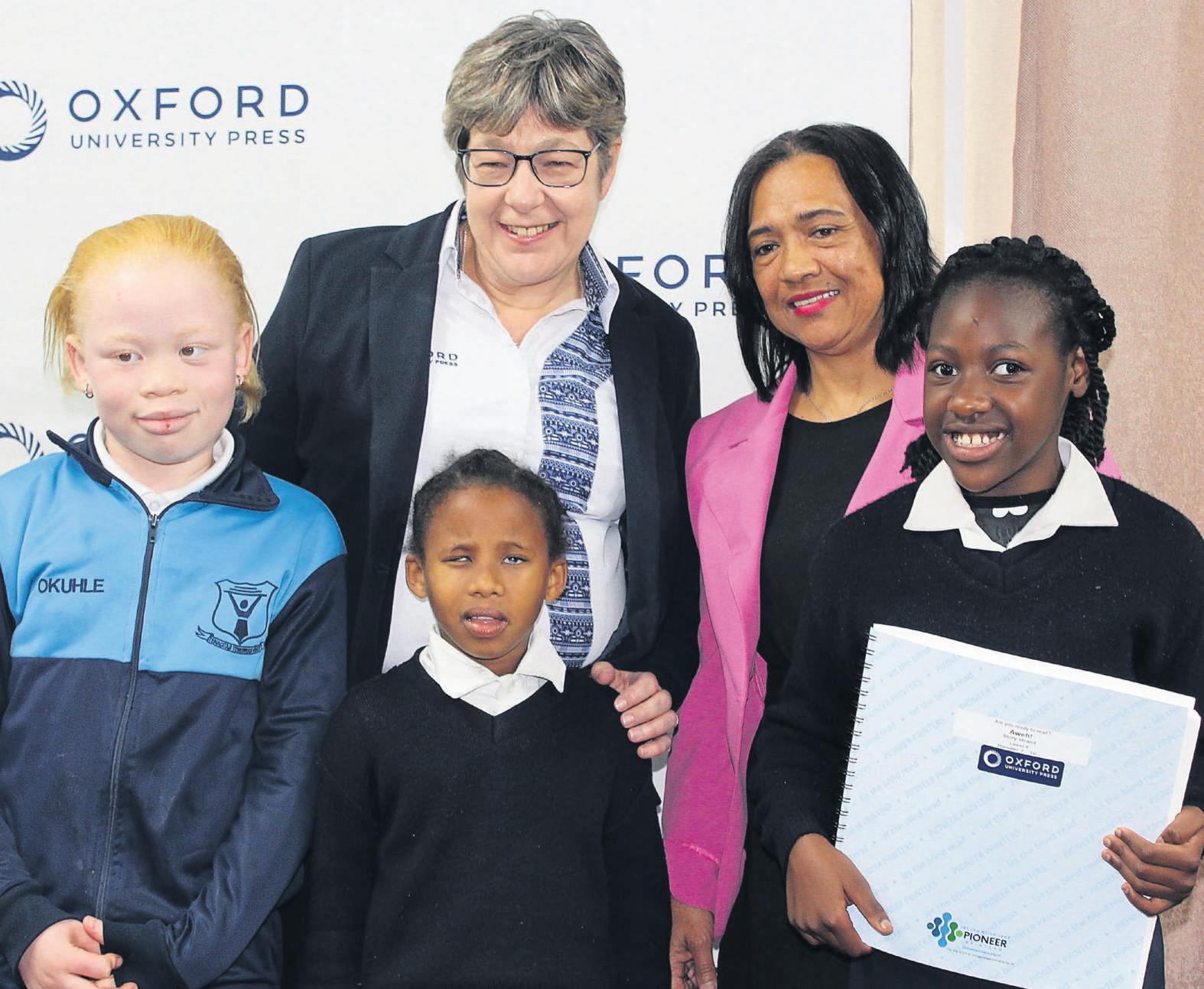 At the back is Karen Simpson,managing director for Africa at Oxford University Press with school principal, Gail Williams in front from left is Okuhle Vellum,Taraji Hurukuru and Mia Julie