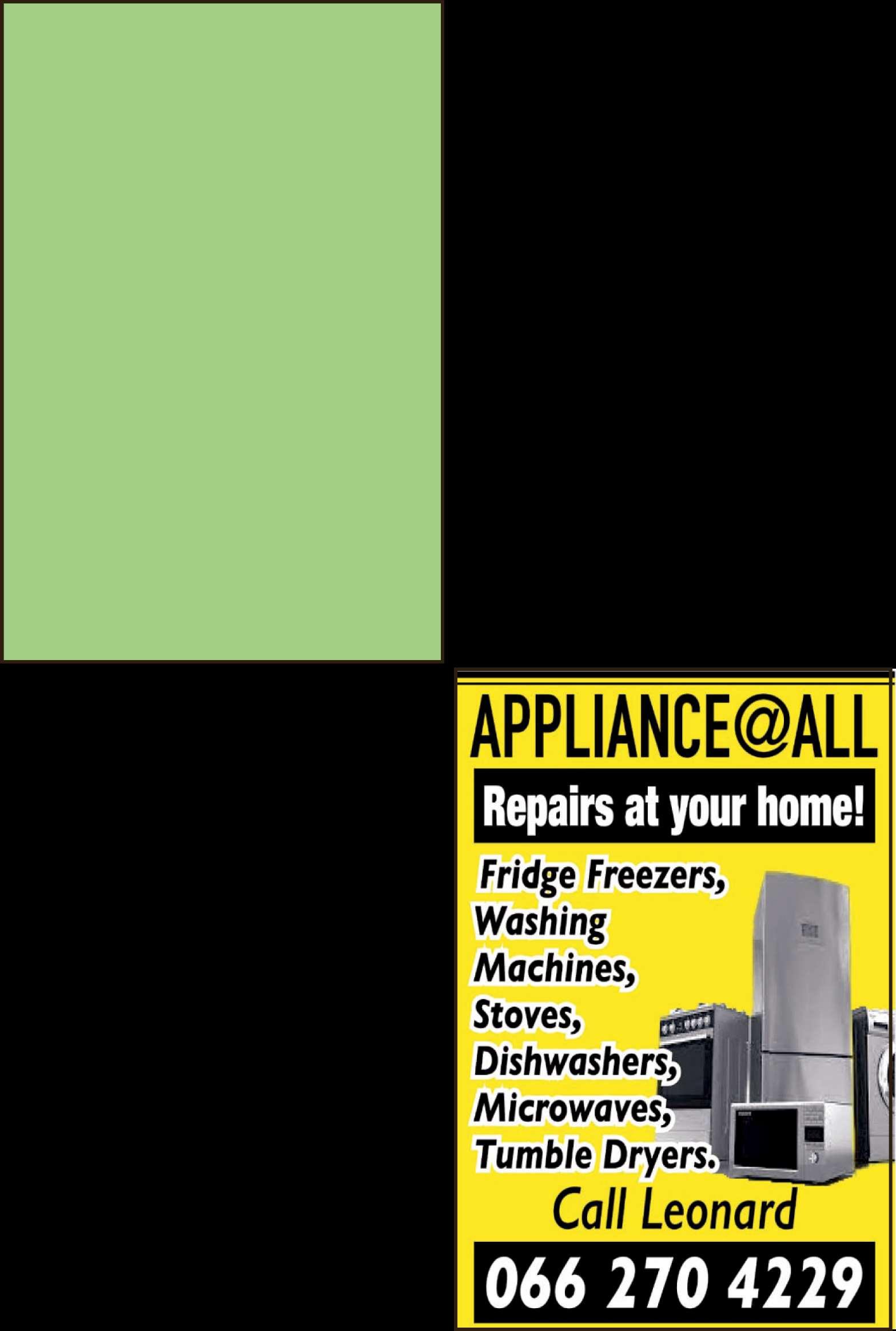 Fridges, freezers, washing machines, stoves, dishwashes, microwaves, tumble dryers. We do insurance claims. We do all kinds of makes of appliances. Card facilityavailable Marco 068 039 8341