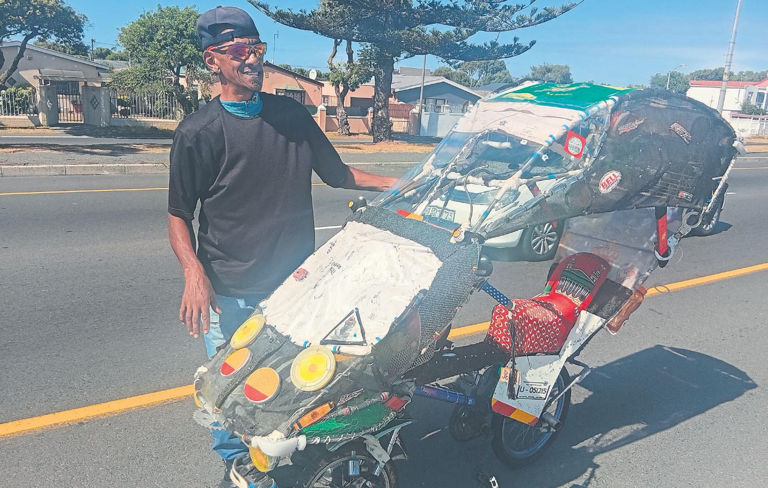 TygerBurger caught up withthe eccentric cyclist in Woodlands, Mitchells Plain, last week, while he was on his way to “Winners”,whichisthe name of anow defunctsupermarket in Lentegeur. He gave thepaperanexhibition of his multi-coloured andmulti-textured “bicycle”, while he stopped to catch his breathalongside Highlands Drive.