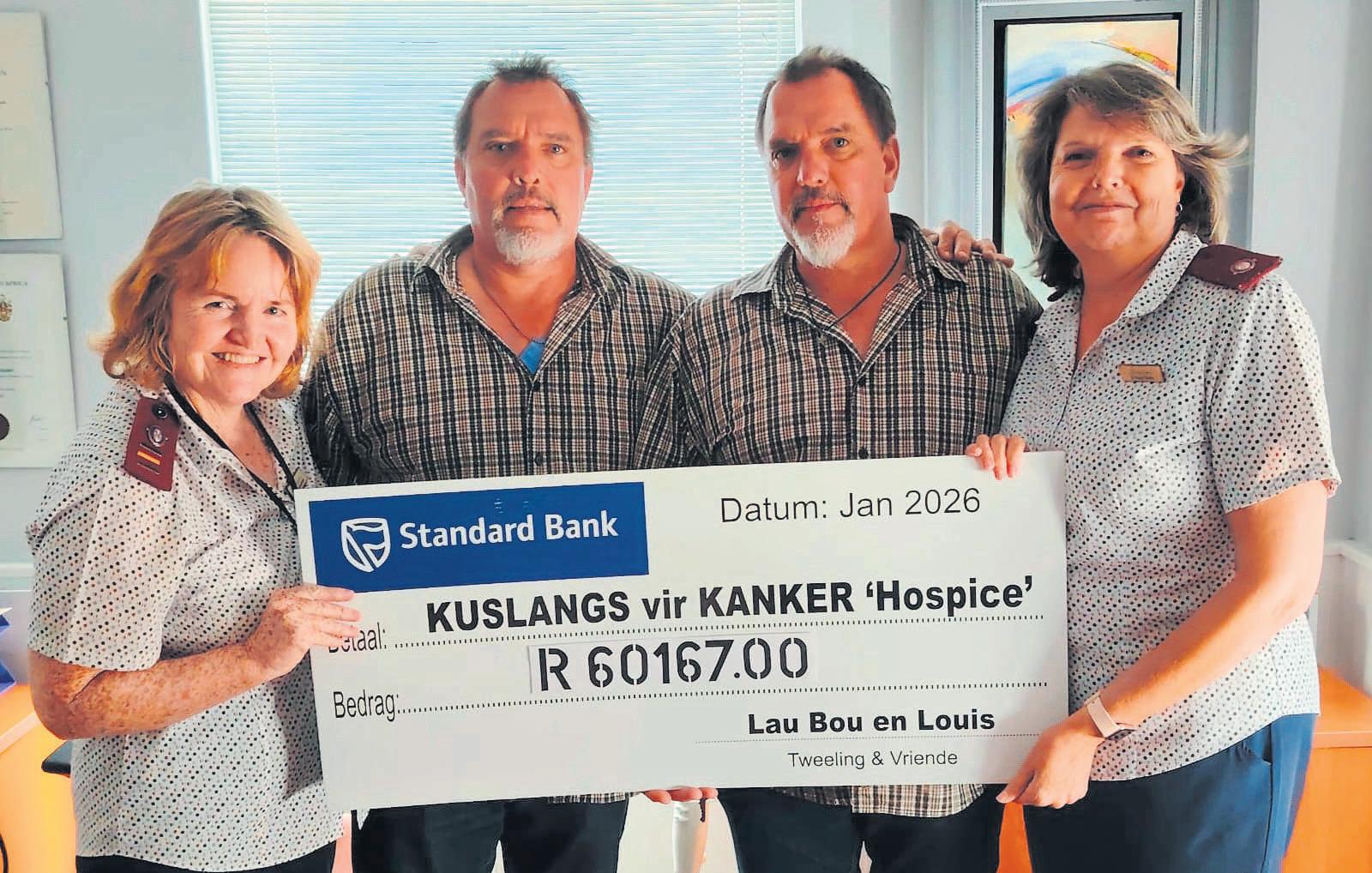 Die Brackenfell-broers Bouwer and LaurentiusSchoonwinkel oorhandig‘n tjek vir sowatR60 000,wat hulle onlangsmet‘n staptog kuslangsindie Overbergingesamel het vir die OverbergHospiceinHermanus.Links vandie tweeling is Susanvan Sittert,enregsRalie Dicks