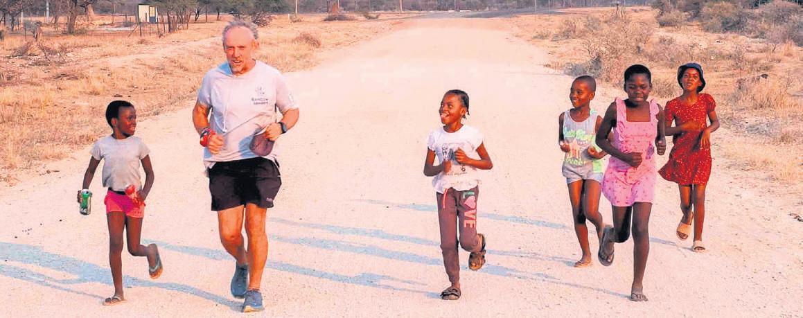 Keith Boyd was welcomed on his first day in Botswana by this group of children,who joined him running The photo features on the backpage of his book Running Africa.