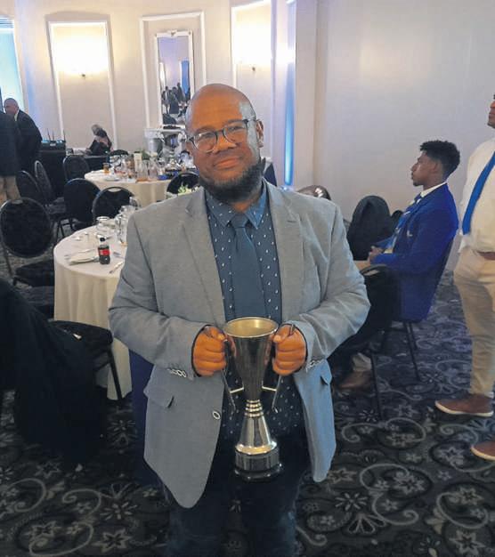 Warrick Gelant,Stormers-heelagter, oorhandig hier die beker aan Victor Thomas van Kraaifontein,afrigter van Van der Stel-Evergreens se vroue,wat die seisoen onoorwonne afgesluit het.VDE se vroue het in die eindstryd op