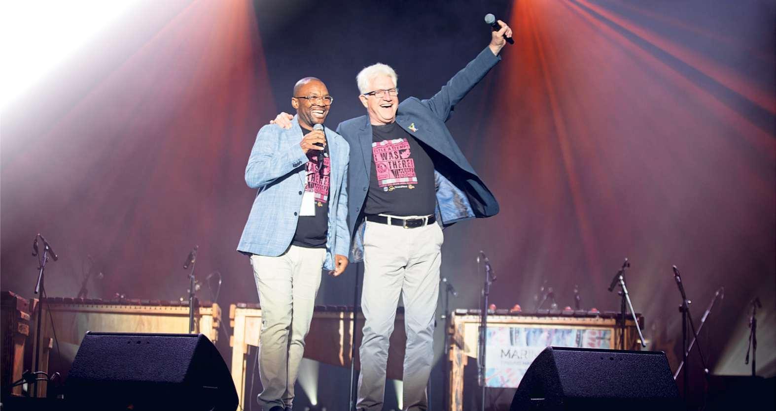 Piet Pretorius (regs) en Robert Buck,voorsitter van die WP-meestersatletiekvereniging,spog met Pretorius se Suid-Afrikaanse en Afrika-rekordtyd van 63:16 by die Westelike Provinsie Meesterssnelstapkampioenskap - 29 sekondes vinniger as die vorige rekord!