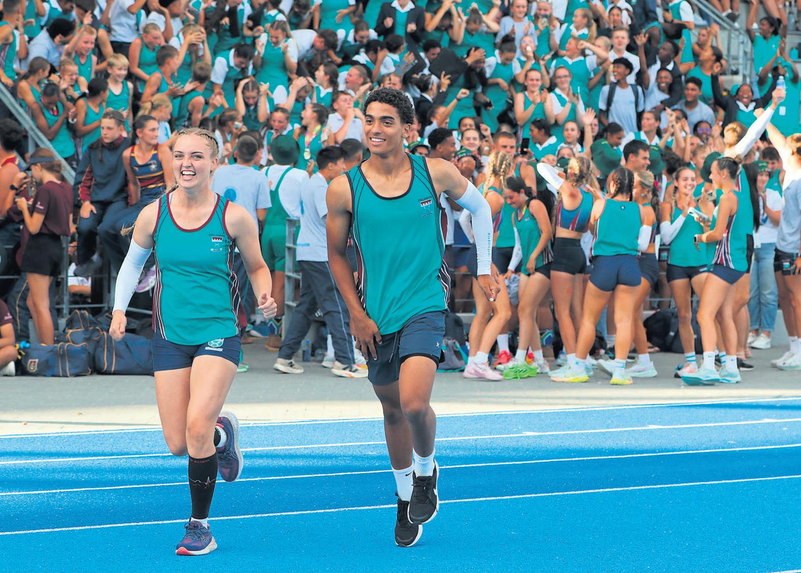 en Luke Raffelsvan die Hoërskool Stellenberg draf nader om die atletiekbeker in ontvangsteneem nadat dieStellies Saterdag vir dievierde agtereenvolgende jaar dieDTBS-atletiekbeker gewenhet