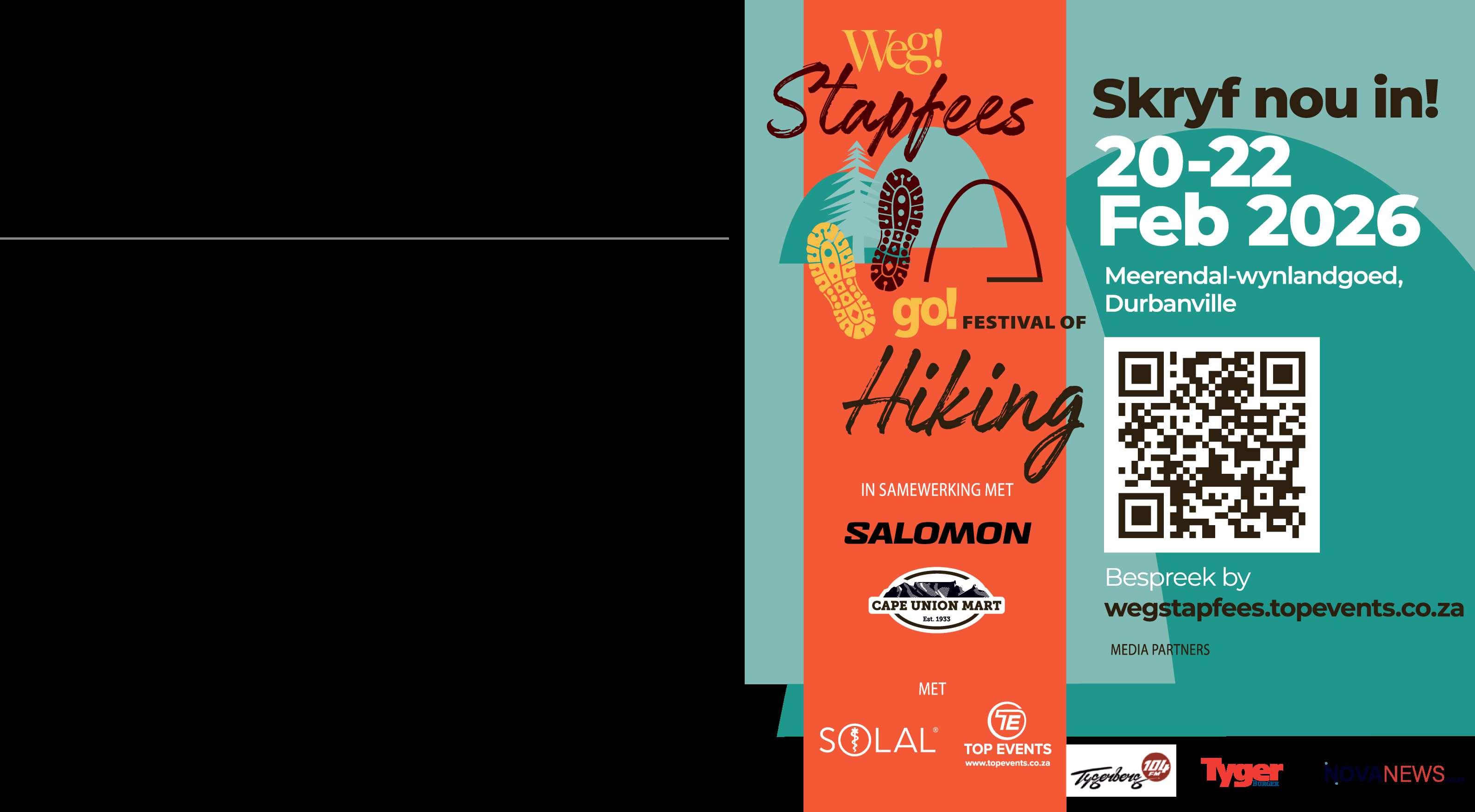 Stappers kan beginstrek vir die volgende Weg-stapfeesinsamewerking met Salomon en Cape Union Mart. Die fees word van 20 tot 22 Februarie op Meerendal buite Durbanville aangebied. Die Weg-stapfees is 'n lekker bederf vir stappers. Dis 'n naweek waar jy jou fiksheid vir die Vis-, die Otterof die Amatolaroete in dieveld kan toets en sommer lekkerkan gesels metander mense wat versot is op stap. Dit werksoos'n pretloop, maar jy stap.
