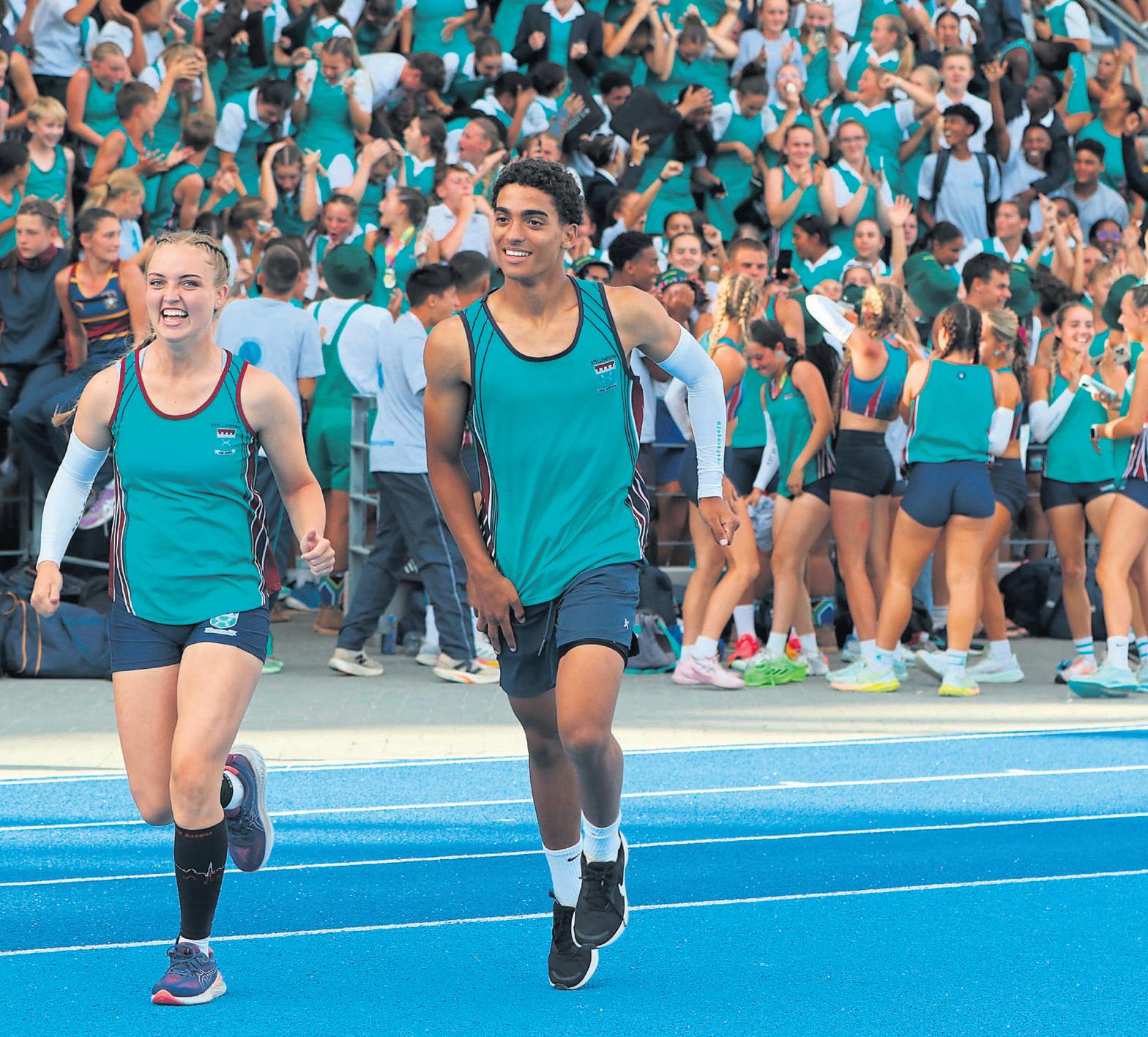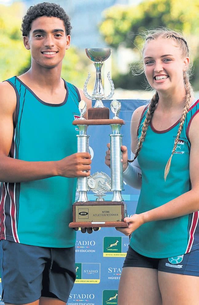 MichaelaSterley en Luke Raffelsvan die Hoërskool Stellenbergdrafnader om die atletiekbeker in ontvangsteneem nadat die Stellies Saterdag vir die vierde agtereenvolgende jaar die MTBS-atletiekbekergewen het DF Akademie het op die pawiljoen skoonskip gemaak deur beide die“flashes”- en geesbeker te wen.Regs wyshulle trots dietrofee. Sien bladsy8 vir uitslae en foto’s FOTO’S:CARINAROUX