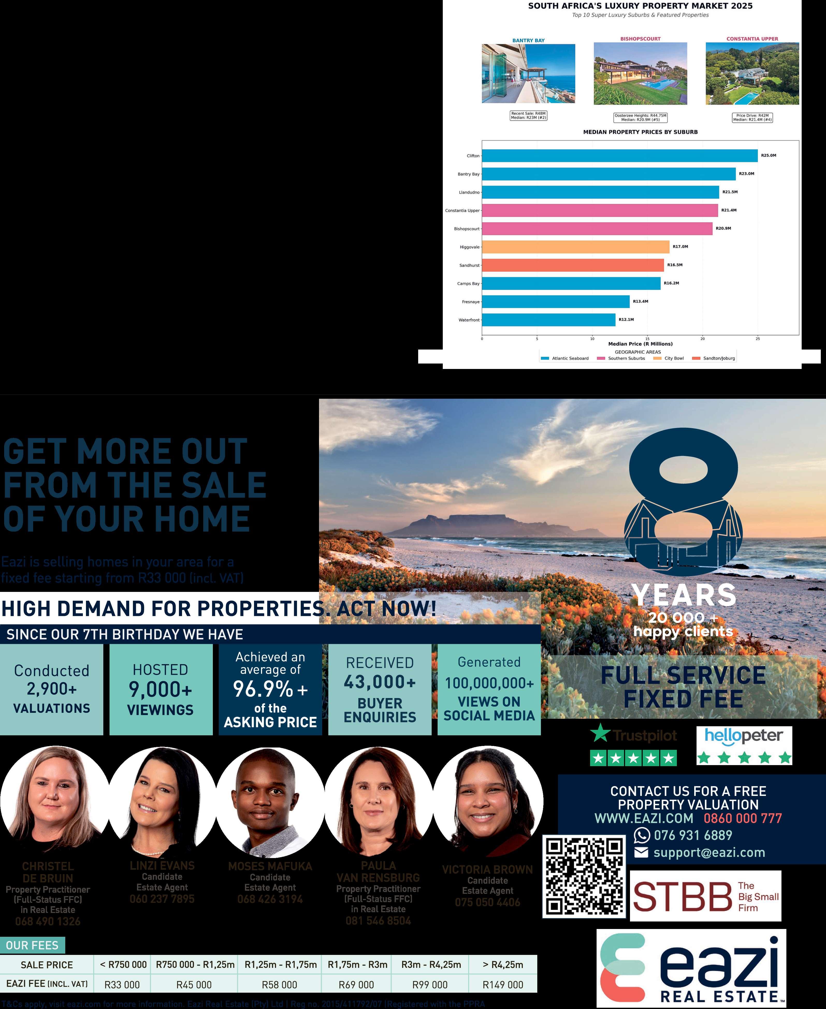 The five top suburbs in the country now boast an average house price upwards of R20 million, all located in Cape Town which makes up nine of the top 10 suburbs by price value for this year, according to the Seeff Property Group A record 146 properties have sold for over R20 million, generating over R5 billion in value for this year so far – exceeding the total for the whole 2024-year in volume and value Of these, 15 sold for