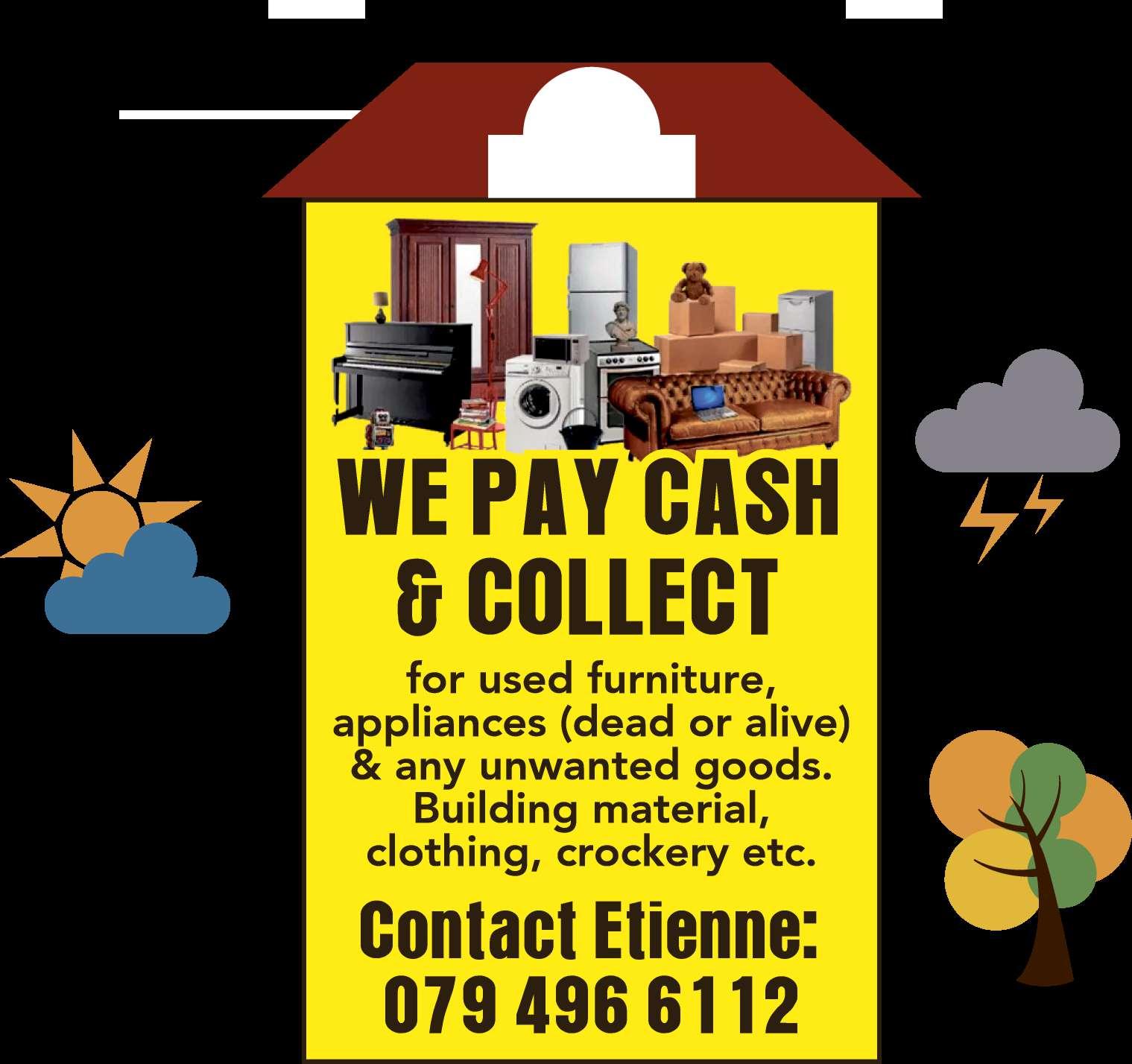 kontant vir enige huis-houdelike goed klere, skoene, beddegoed, gordyne, speelgoed, oudhede, juweliersware - goud, breekgoed, potte, elektroniese ware. MEUBELS yskaste, beddens, Sitkamerstelle, tv's (en