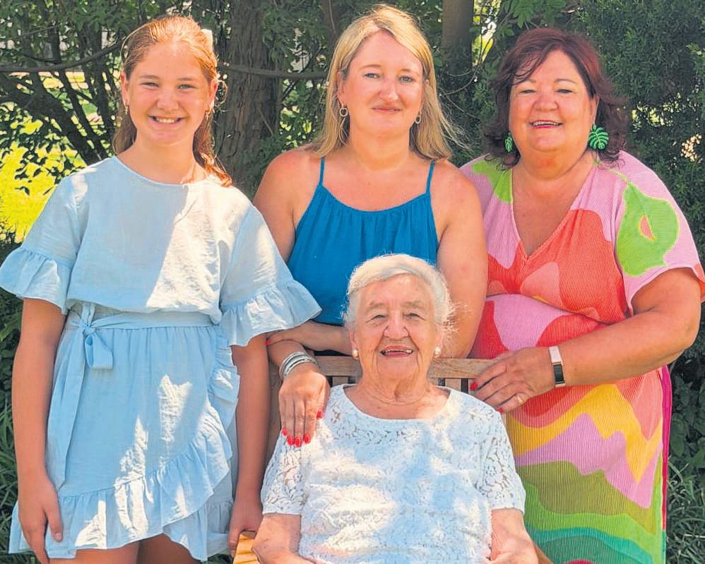 Yvonne Bredenkamp(voor)issaam methaar familielede tydens‘n vroeëverjaarsdagviering op 10 Januarie.Saam met haar is (van links) Luné Hattingh (agterkleinkind), Lumari Hattingh (kleinkind) en Loreth Visser (dogter)