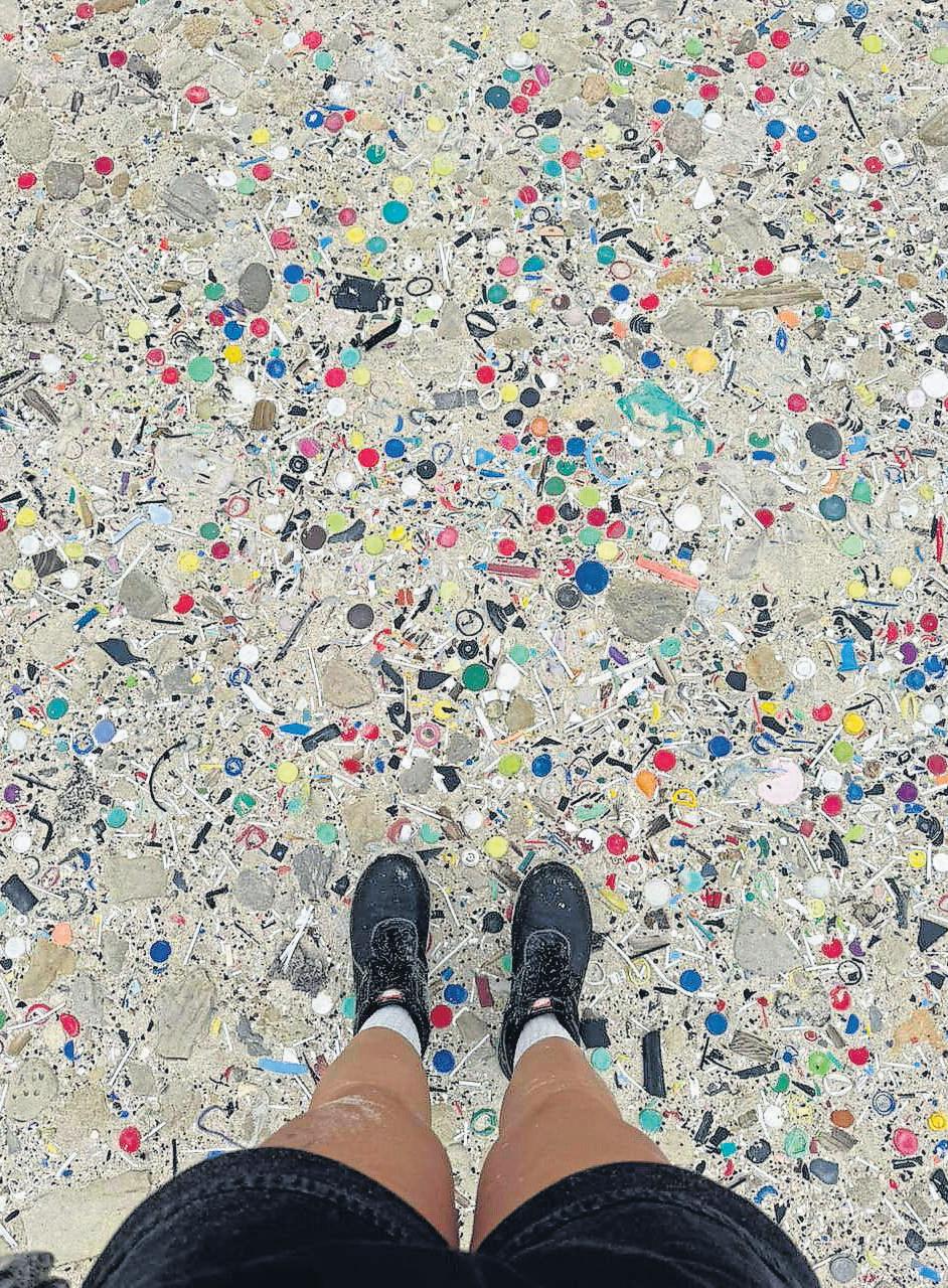 ZoëPrinsloo collects plastic bottle caps during a shoreline clean-up