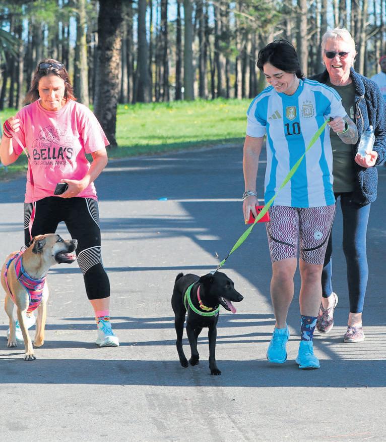 Marlene Willcocks,Bianca Smyth en Louise du Preez van Durbanville het die pretloop voltooi met Daisy (links) en Gracie,wat albei by Bella’s Guardian Angels aangeneem is