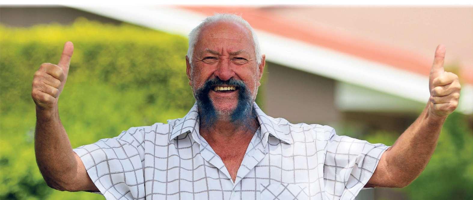 En as jy hom raakloop met sy blou snor, knoop gerus 'n geselsie aan