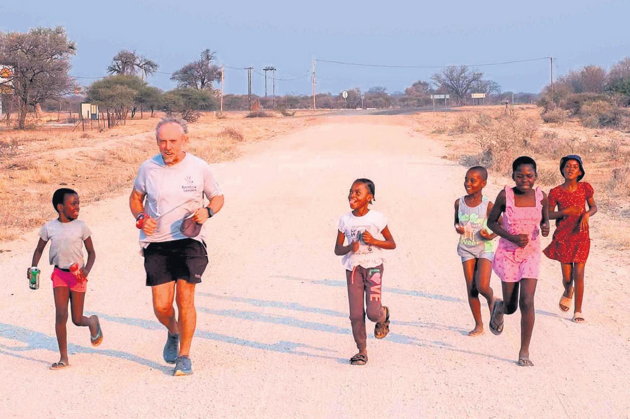 Keith Boyd was welcomed on his first day in Botswana by this group of children,who joined him running The photo features on the backpage of his book Running Africa