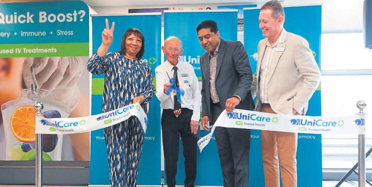 The ribbon-cutting ceremony marking the official transformation of M-Kem 24 Hour Pharmacy into UniCare 24/7 Trusted Health in Bellville took place on Tuesday 11 November The rebranding represents a significant milestone in Clicks Group’s expansion of 24-hour pharmacy services across South Africa,while maintaining the same trusted healthcare team and services that customers have relied on for decades Founder Hylton“Mr M” Mallach (second from left) worked closely with Clicks Group to ensure continuity of care during the transition With him are,from left,Bertina Engelbrecht,Dhevan Pillay and Jan Roos,from Clicks Group.