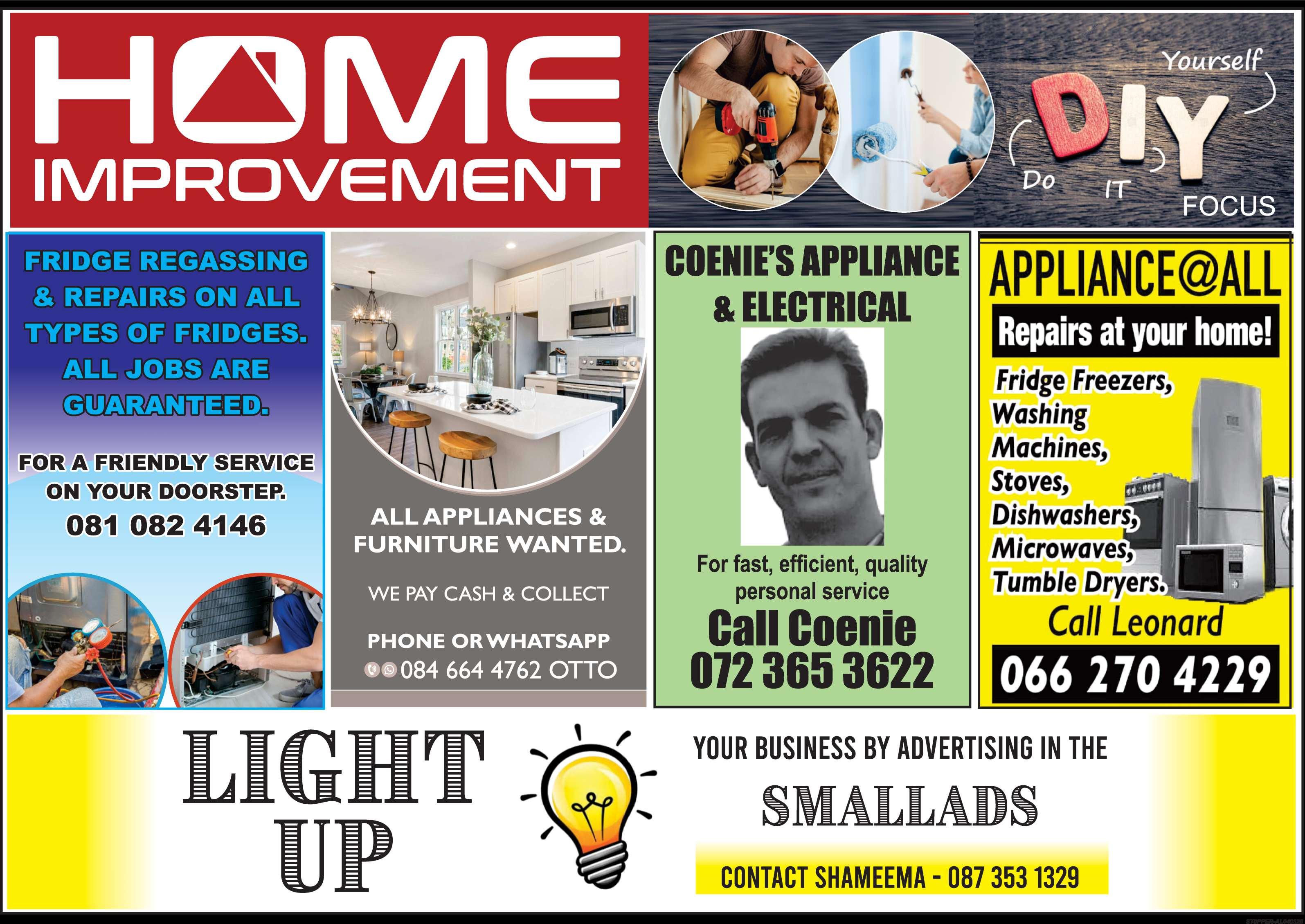 We repair appliances. Fridges,stoves, washing machineswith guarantee and regas from R180. Cathy /Francois 079 838 1851 Allareas Boomsloop, snoei, verwyder Johannes 074 7892176