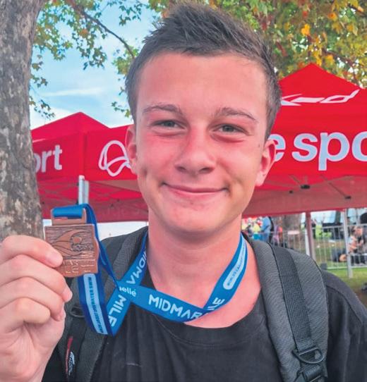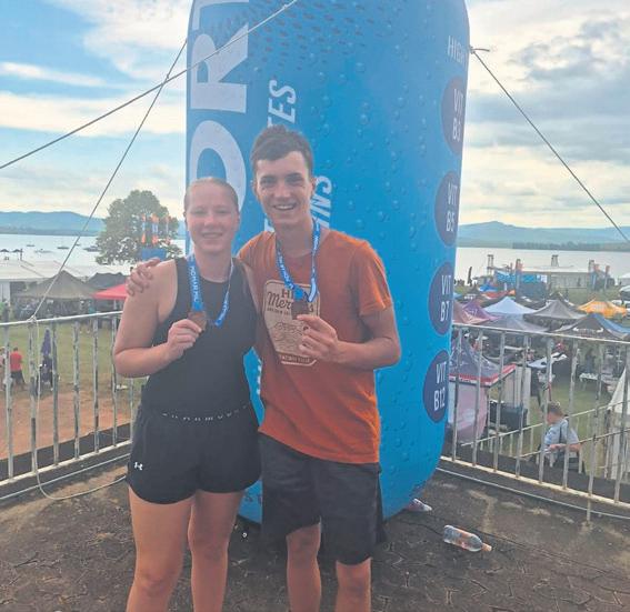 Ashley Seymour en Drake O’Tool, twee van die Goudveldse swemmers wat vir die Midmarmyl-uitdaging in die water was, wys hul medaljes.