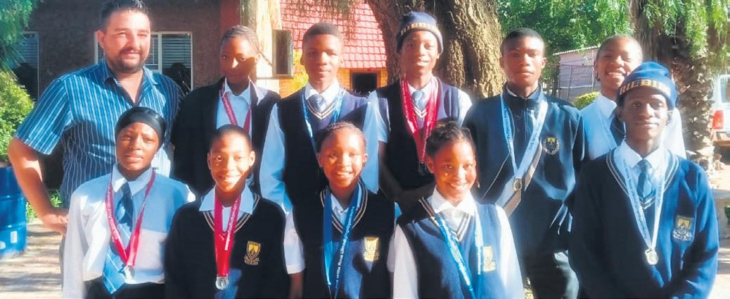 The Riebeeckstad athletes who performed well at the Willie le Roux invitational athletics meeting are from the left, front: Queen Motaung, Kgauhelo Lepheane, Fifi Tau, Kgalalelo Lepheane and Prince Masowa; back: Robert Slabber, Itumeleng Jampi, Moiloa Khobi, Andries Moreki, Atlehang Erasmus and Bania Lulua. PHOTO: Supplied