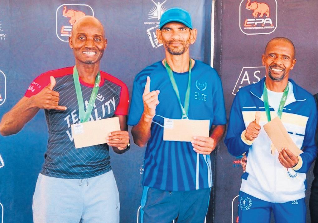After the finish of the Nelson Mandela Bay Gqeberha 50km Ultramarathon, full of smiles is Nkhetheni Masupa (left) with fellow 50 - 59 years podium finishers Noel Adams and Sandiso Ngxis. PHOTO: Supplied