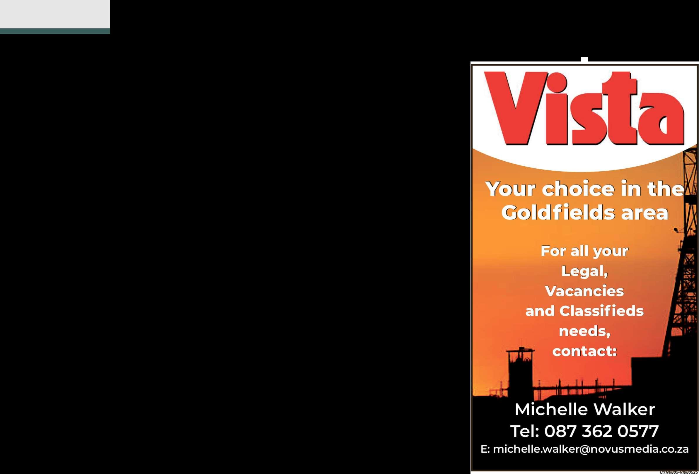 ■ Vista approached the Lejweleputswa municipal manager, Lesley Motlatsi Makhetha, for comment. At the time of goingtopress he has not responded. Theexcutivemayor is Veronica Ntakumbana